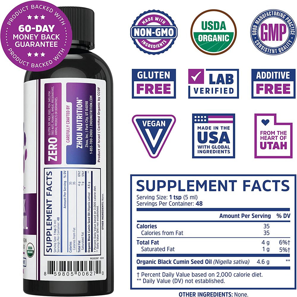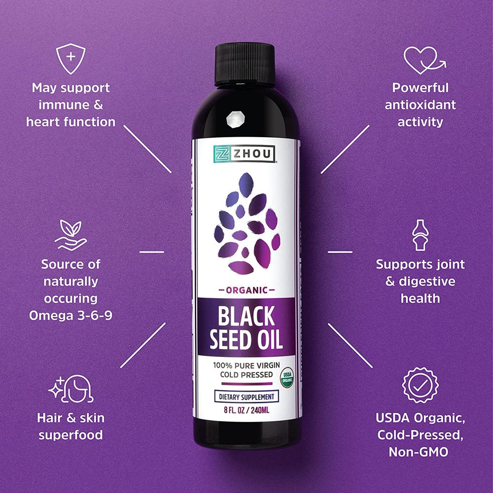 Zhou Organic Black Seed Oil | 100% Virgin Cold Pressed Omega 3 6 9 | Super Antioxidant for Immune Support, Joints, Digestion, Hair & Skin | Vegan, Gluten-Free, Non-Gmo | 8Oz is backordered and will ship as soon as it is back in stock.
