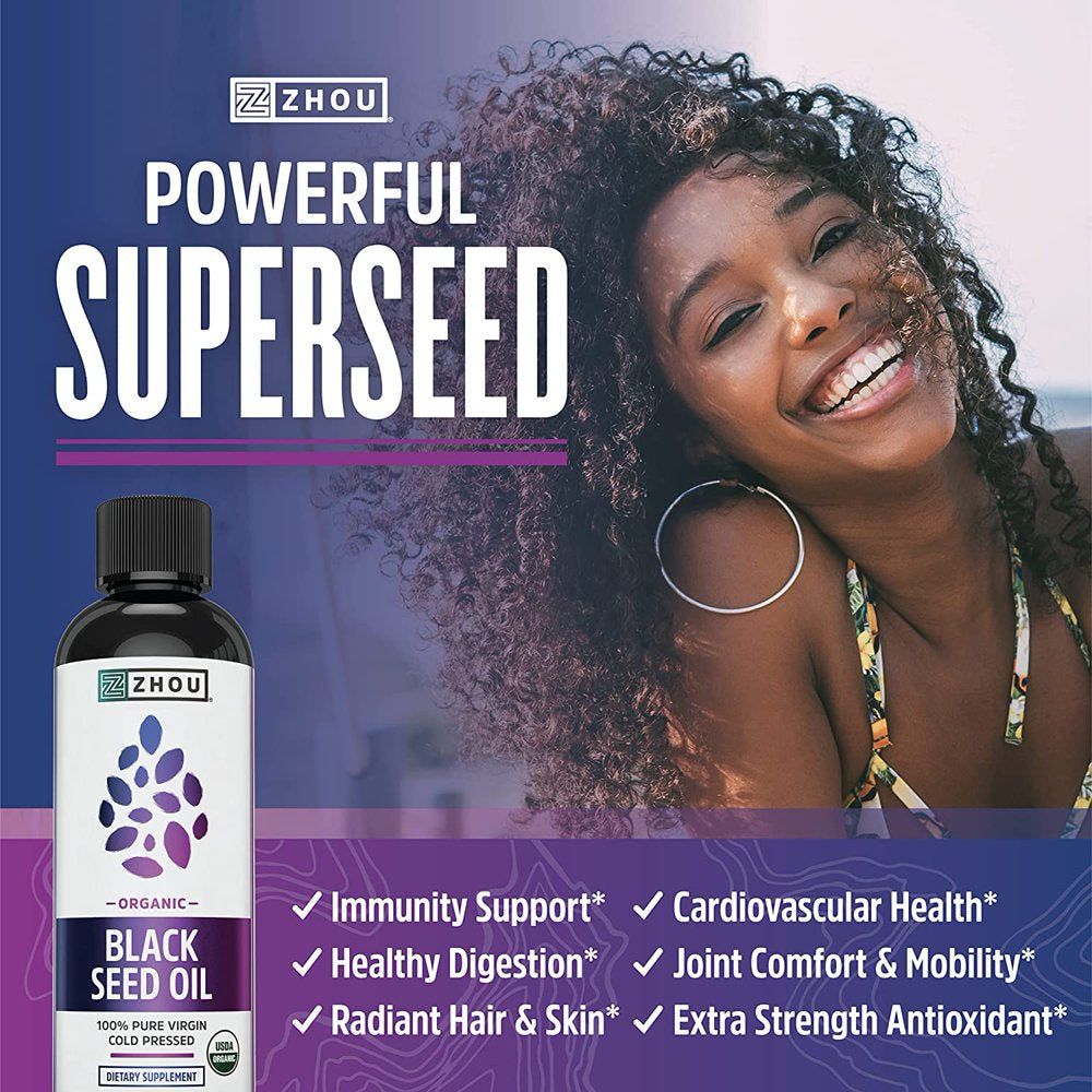 Zhou Organic Black Seed Oil | 100% Virgin Cold Pressed Omega 3 6 9 | Super Antioxidant for Immune Support, Joints, Digestion, Hair & Skin | Vegan, Gluten-Free, Non-Gmo | 8Oz
