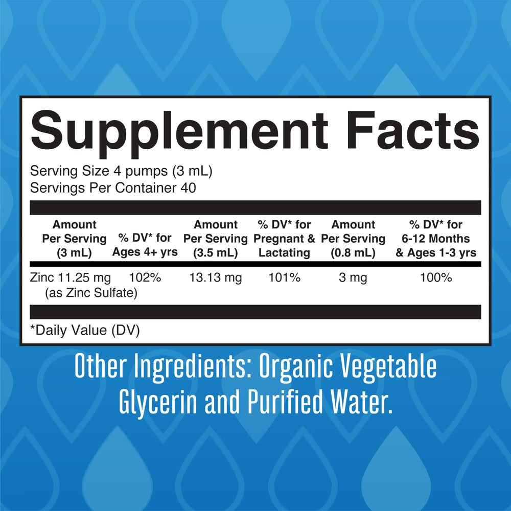 - Immune Support Supplement: Pure zinc vitamin supplements was formulated for Adults & Children (4 and over): 3 mL = Approximately 4 Pumps. Store in a cool, dry place. Keep out of reach of children in case of accidental overdose or choking. *The dropper typically fills about ⅓ of the way with 1 pump.