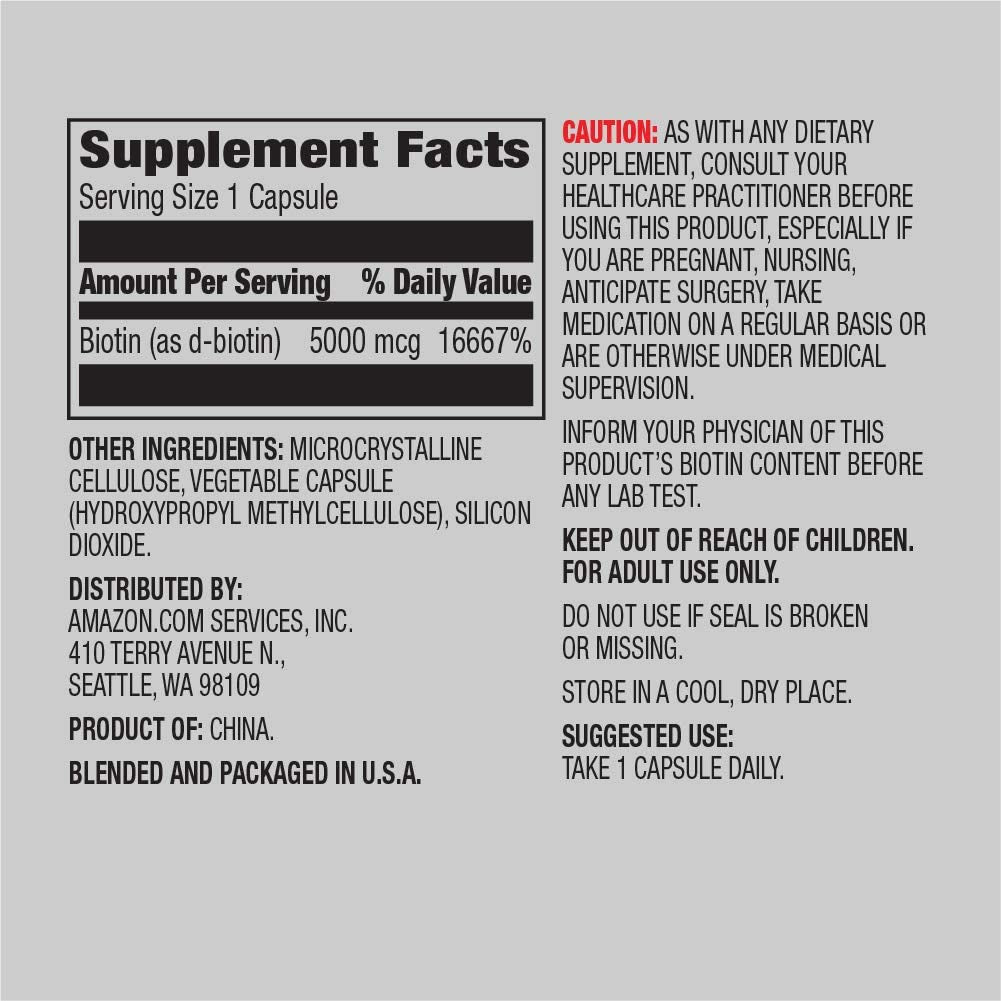 Helps maintain normal hair, skin, and nails. Supports normal brain function and cognition. Supports normal energy metabolism. Our once-daily vegan biotin supplement is produced through a series of synthesis reactions. If you like Eu Natural Biotin 5000mcg Hair, Skin, and Nails capsules, we invite you to try Amazon Elements Biotin.