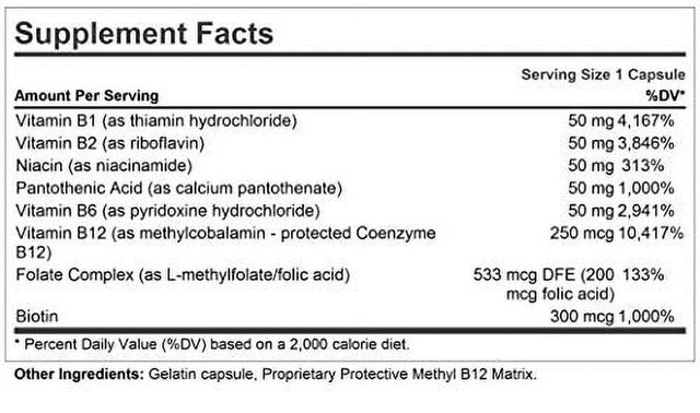 UNPARALLELED AND CONVENIENT SOURCE OF ALL B-COMPLEX VITAMINS The most advanced high potency blend of all B-Complex vitamins. Our unique B12 avoids the use of Cyanocobalamin and instead provides our special absorption-protected natural Coenzyme form of Methyl B12. Promotes healthy cell growth, including hair, skin and nail growth, as well as detoxification (liver), immune function and tissue repair. Essential to healthy brain, nervous system function, heart and cardiovascular system function.,SUPERIOR 100% PURE BIO-ACTIVE INGREDIENTS Provides high potency of B-complex. Contains NO Milk / Dairy-Free, Gluten-Free NO soy, yeast, corn, wheat, sodium, salt, sugar, fat, cholesterol, color, preservative, common allergens or manufacturing additives.,UNSURPASSED PURITY, QUALITY, & EFFICACY. WON T UPSET YOUR STOMACH! For 40+ years ProCaps products have contained NO additives of any kind. NO binders, fillers, lubricants, stabilizers, flowing agents, preservatives or artificial colors. Easy-to-swallow capsules (NO tablets) deliver only the MOST bioactive vitamins, minerals & ingredients in an ultra-fine micro-granulated powder for fast, complete absorption & maximum effectiveness. Non-acidic formula is gentle even on most sensitive stomachs.,MANUFACTURER DIRECT & MADE IN USA ProCaps formulates, manufactures, and packages ALL of its products in ProCaps own laboratory and manufacturing plant in Nevada, USA. Unlike other nutritional supplement brands that utilize contract manufacturers, ProCaps controls every aspect of its products from formulation design to ingredient sourcing, production techniques, and quality control making ProCaps supplements the purest, safest, and most effective all-natural supplements available.,ETHICAL & ECO-FRIENDY. ZERO CARBON FOOTPRINT Uniquely committed to your health and the health of the planet, ProCaps facilities are 100% Solar Powered with a Zero Carbon Footprint and an LEED GOLD green building status. ALL ProCaps bottles are made from 100% recyclable post-consumer resin. Plus, Andrew Lessman and ProCaps are the largest donor of prenatal vitamins in the world (over 1 billion capsules donated to date). ProCaps, the Informed Choice for Nutritional Supplements.