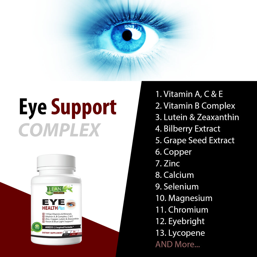 LEAN Nutraceuticals Eye Health Plus with powerful eye health support formula provides ultimate full eye health support. The 100% natural eye support supplement supports eye aging and daily stress such as eye dryness, eye fatigue, eye strain, protection from blue light, and recovery from eye glare. The vegan keto paleo capsules are made in USA with premium quality ingredients to support eye sight and night vision for women and men.* LEAN Nutraceuticals Eye Health Plus contains the exact six nutrients (lutein, zeaxanthin, vitamin E, vitamin C, zinc, and copper) recommended by the National Eye Institute’s Age-Related Eye Disease Study 2 (AREDS2) to help reduce the risk of progression of Age-related Macular Degeneration (AMD)*. LEAN Nutraceuticals Eye Health Plus contains more extensive eye health support ingredients than other eye supplements. These eye vitamins, eye mineral and eye nutrients work together to promote health of all parts of eyes including Retina, Lens, Cornea, Ciliary, Iris, Vitreous, Blood flow, Conjunctiva and Intraocular Pressure.