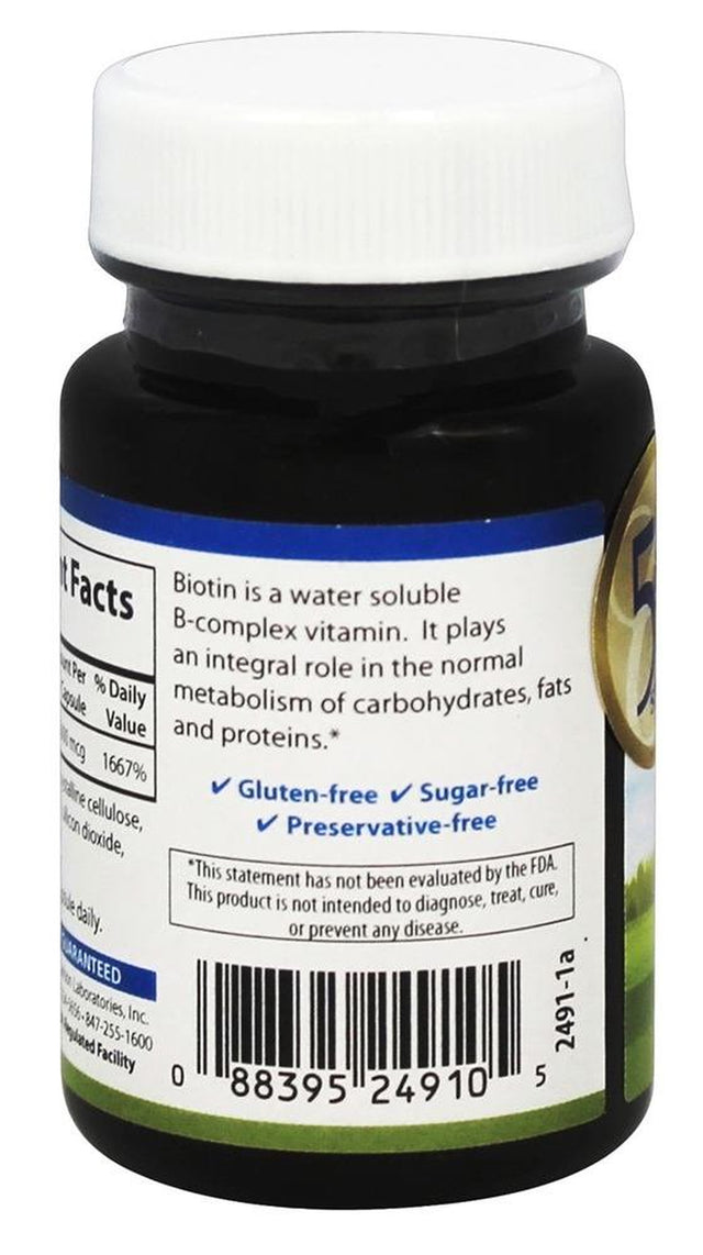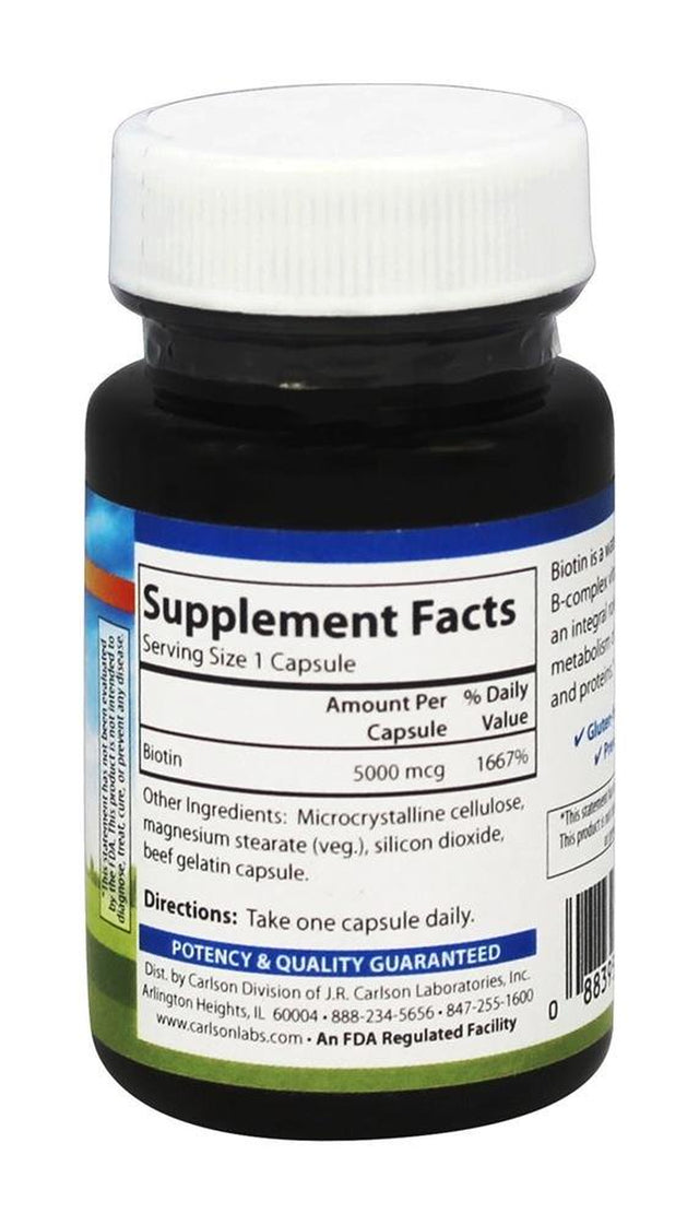 Carlson Labs Biotin 5000 mcg. - 50 Capsules Carlson Labs Biotin 5000 mcg. is a water soluble B-complex vitamin. It plays an integral role in the normal metabolism of carbohydrates, fats and proteins. Gluten Free Sugar Free Preservative Free Your Needs are ImportantCarlson Laboratories is keenly aware of what the health-conscious consumer wants in a nutritional supplement.