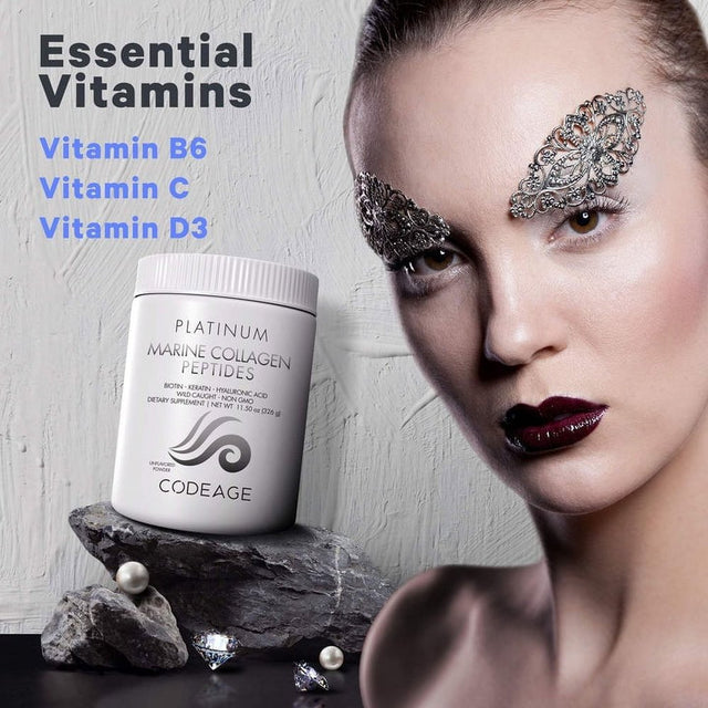 Codeage Wild Caught Marine Collagen Peptides Powder Platinum is a high-quality collagen supplement made from wild-caught marine collagen from North American cold waters. It contains a high level of hydrolyzed fish collagen powder types 1 and 3, 10,000 mcg biotin, vitamin C, vitamin D3, vitamin B6, niacin, pantothenic acid, and hydrolyzed keratin.