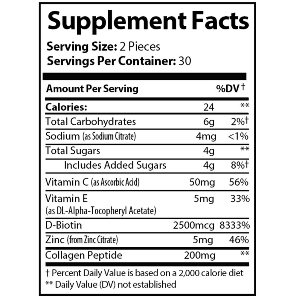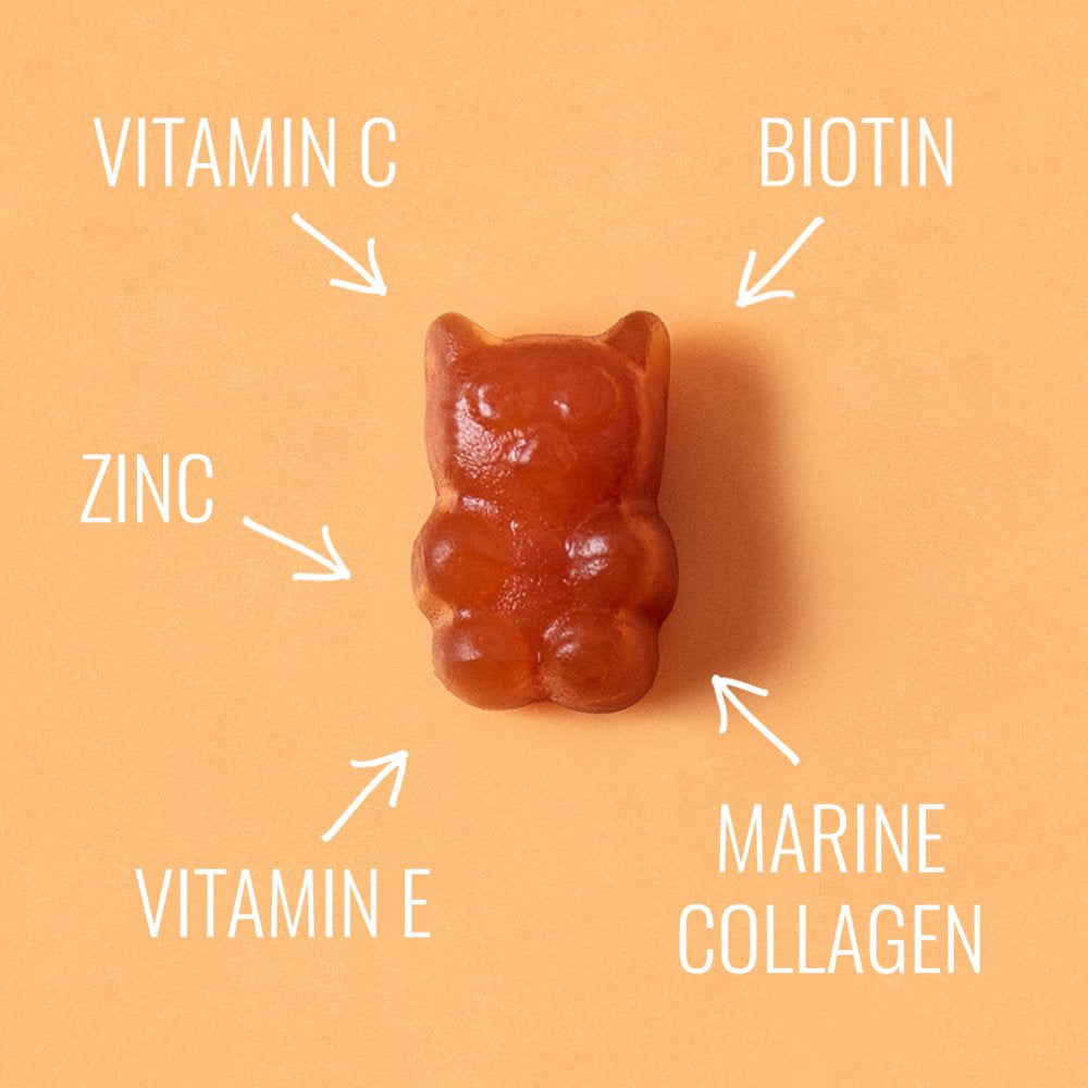- 🍊BENEFITS. Our Marine Collagen Beauty Gummies are packed with beauty-loving ingredients like marine collagen, biotin, Vitamin C, Vitamin E, and zinc to help promote healthier hair, skin, and nails.*