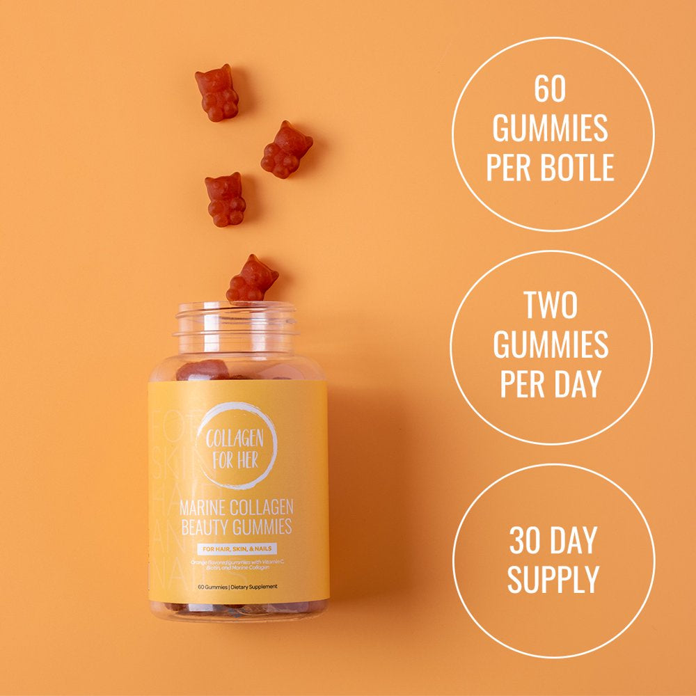 Collagen For Her’s Marine Collagen Beauty Gummies are your beauty routine’s new best friend! These delicious little beauties have been formulated with ingredients like Vitamin C, Vitamin E, Biotin, Zinc, and Marine Collagen to help keep your hair, skin, and nails in tip top shape.* Bonus points: they taste amazing and are pescatarian friendly! Here's what you need to know: -30 day supply -Gluten Free & Non-GMO -24 calories & 4g of sugar per serving -Naturally Flavored: A juicy blend of tropical oranges! -Can be taken alongside any of our other collagen products -Benefits for your hair, skin, and nails