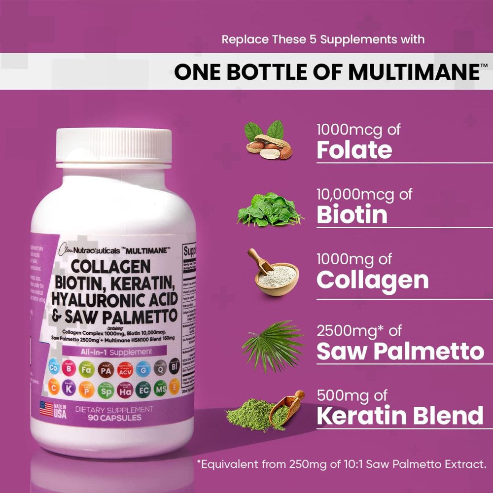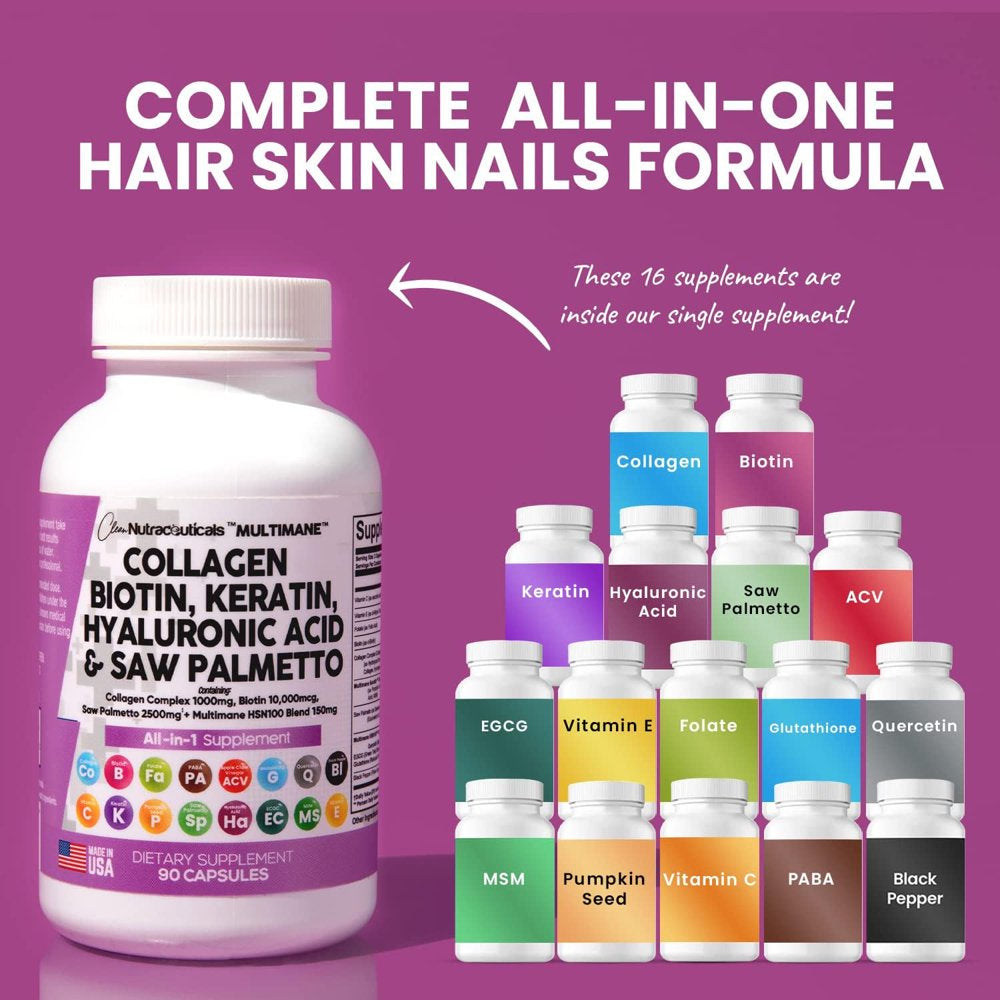 • All-In-One Hair And Nail Vitamins - MultiMane is overflowing with potent collagen type 2, collagen peptides pills, biotin pills for hair growth, and more hair vitamins for women. Clear out those countless hair supplements for hair growth women in your supplement cabinet, and replace it with just one simple serving of collagen capsules for women and collagen pills for men using this 16-in-1 formula from Clean Nutraceuticals. Enjoy quality collagen for skin by taking multi collagen peptides.