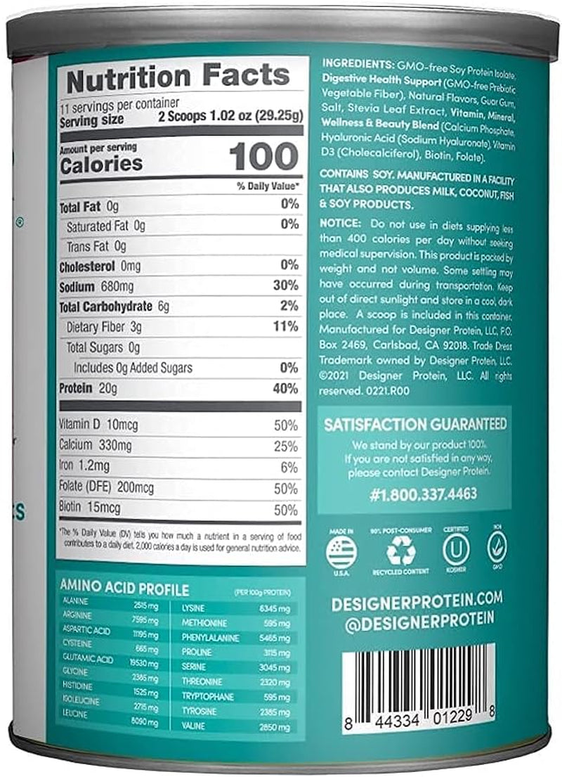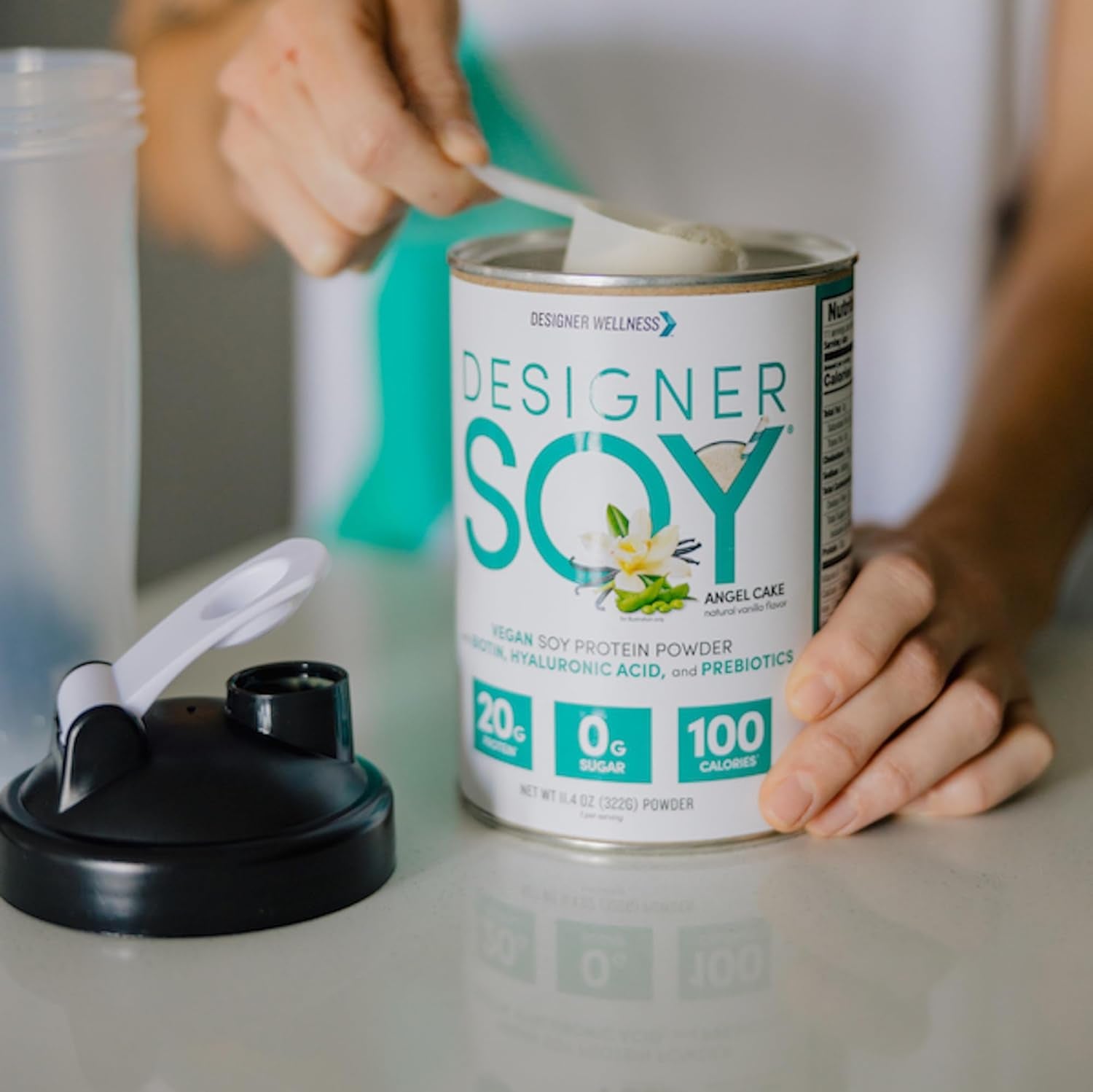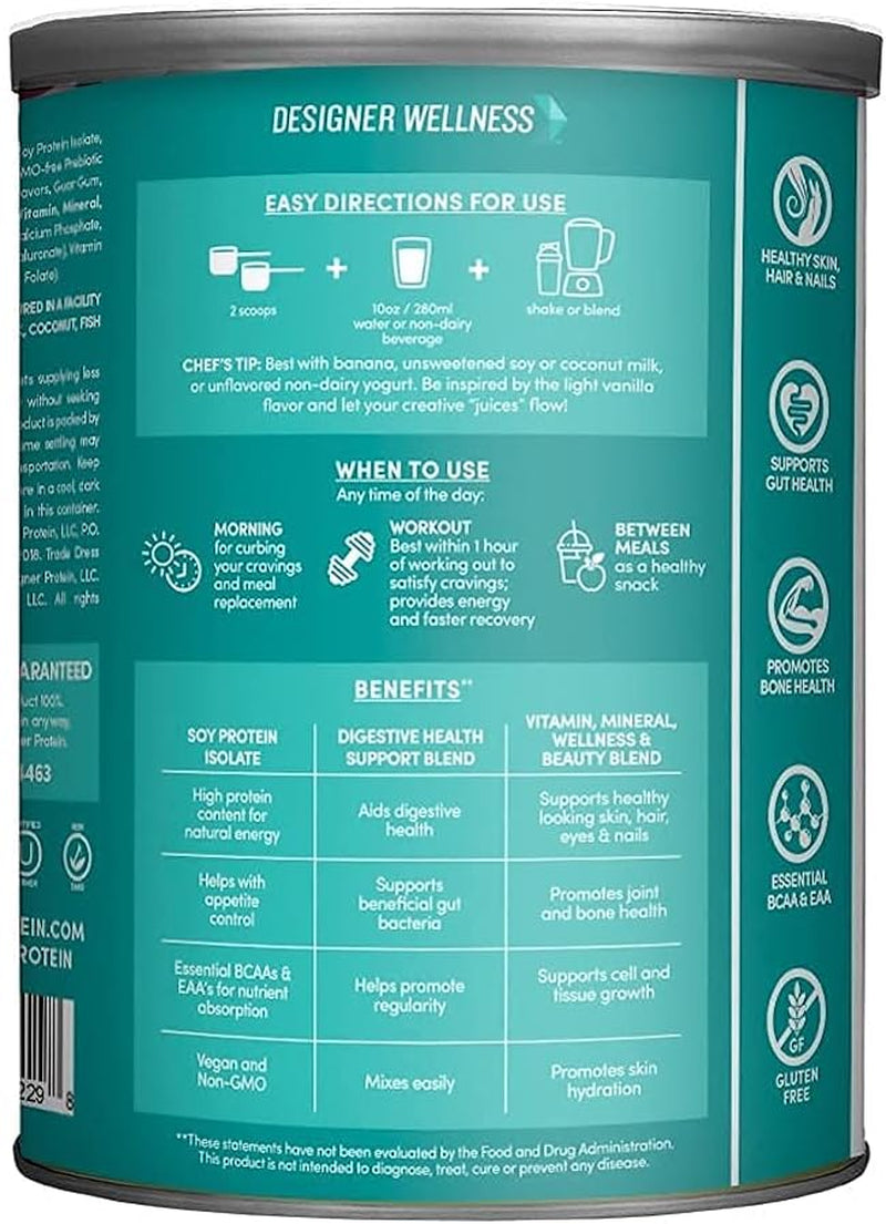 Designer Wellness, Soy Isolate Protein Powder with Biotin, Hyaluronic Acid and Prebiotics, Vegan, Zero Sugar, Non-Gmo, Angel Cake Natural Vanilla Flavor, 11.4 Ounces