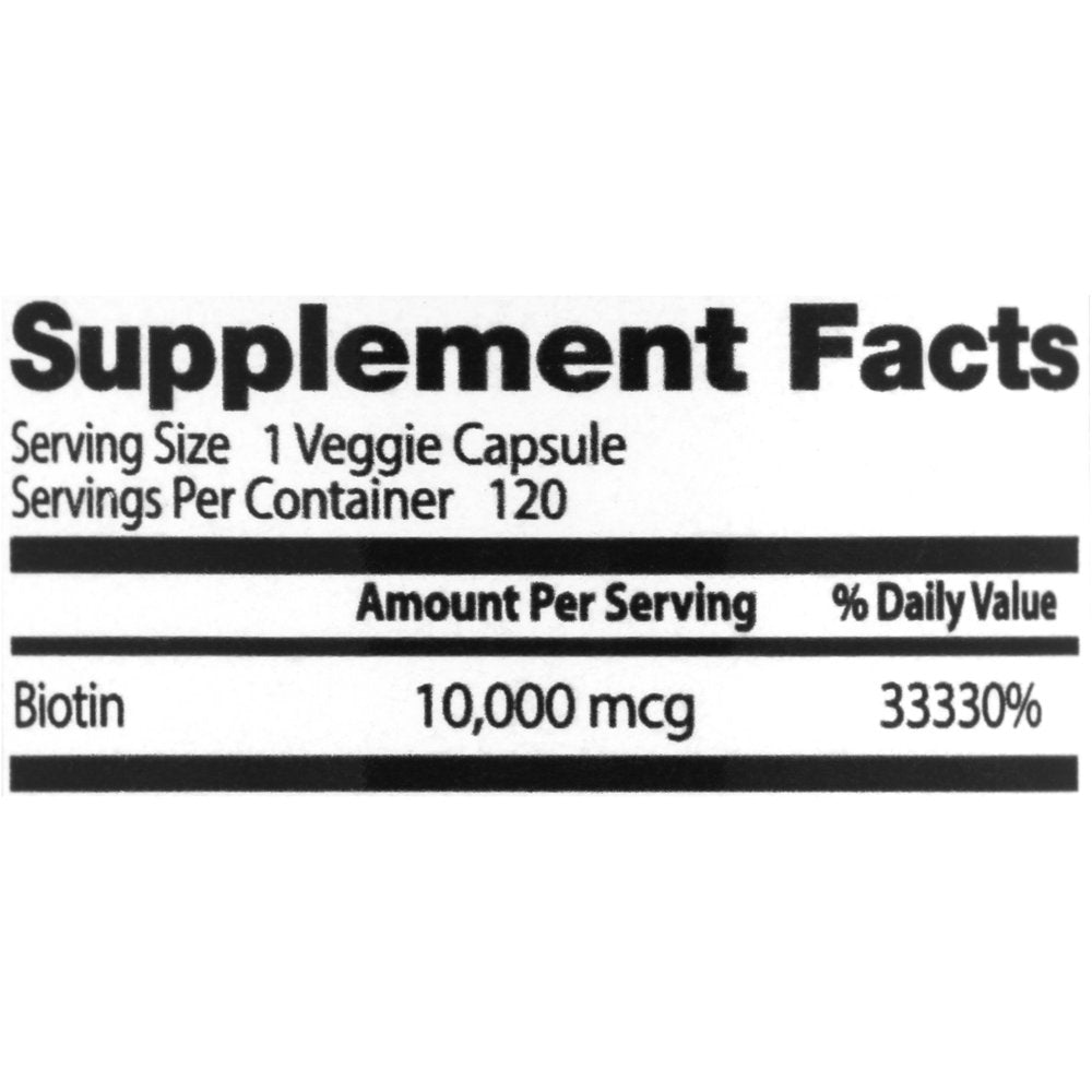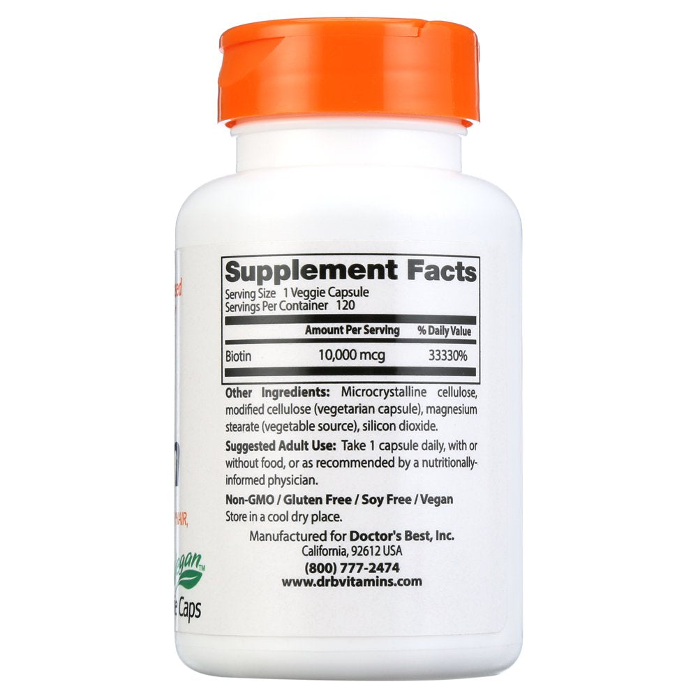 Doctor's Best - Best Biotin 10000 mcg. - 120 Vegetarian Capsules Supplement Facts Serving Size: 1 Capsule Servings Per Container: 120 Amount Per Serving % Daily Value Biotin 10,000 mcg 3,334% Other Ingredients: Microcrystalline cellulose, modified cellulose (vegetarian capsule), magnesium stearate (vegetable source), silicon dioxide./div>