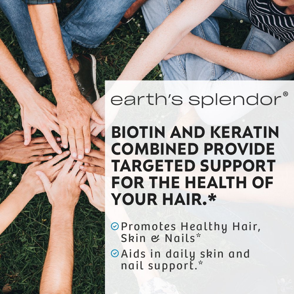 At Earth’s Splendor, we have learned a thing or two from half a century in the supplements business, and we are passionate about applying that to everything we do. We believe buying vitamins should be simple, affordable, and worry-free, so we made it that way. We make high quality vitamins and supplements that enhance your personal health journey for a fair, reasonable price. With us, what you see is what you get. From the explanation of benefits to the ingredients list, expect honesty and clarity. Earth's Splendor Biotin + Keratin supplement aids healthy and strong hair, skin and nails. With 10,000mcg of Biotin and 25mg of Keratin per tablet, experience the benefits of hair, skin, and nail support throughout every day.