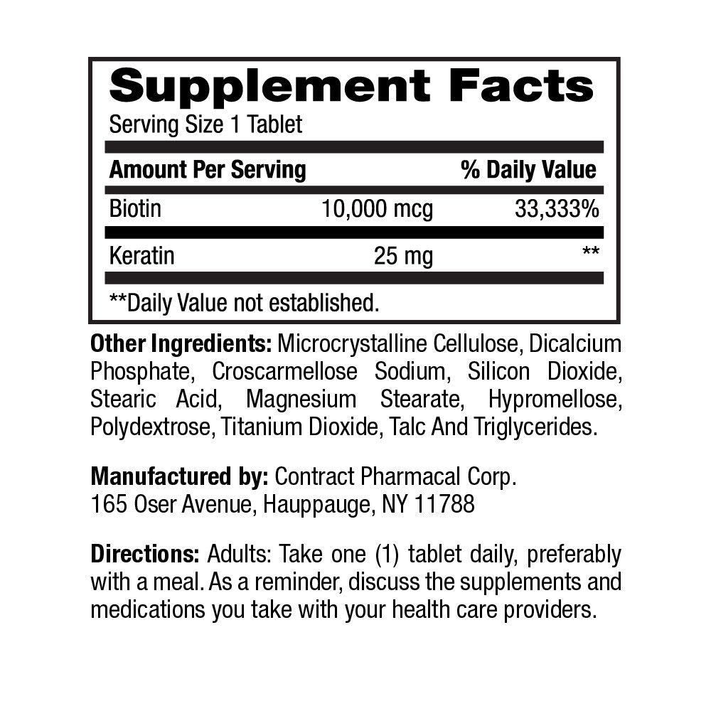 • 60- DAY SUPPLY: One tablet gives you 10,000mcg of Biotin and 25mg of Keratin. With 60 tablets per bottle, you get a 2- months supply delivered straight to your door.