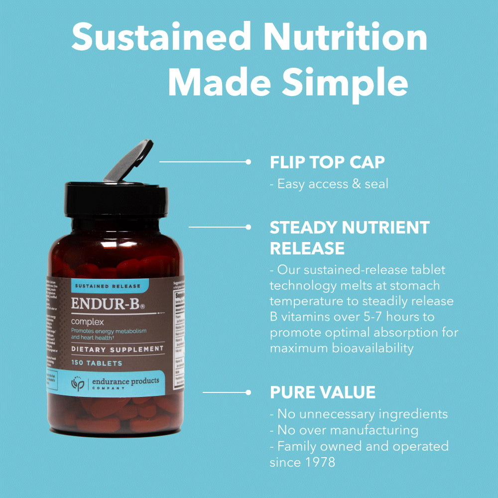 Endur-B Complex - Sustained Release - Vitamin B Supplement with B1, B2, B3, B6, B12, Folic Acid, Biotin - 150 Tablets - Endurance Products Company - 150 Tablets is backordered and will ship as soon as it is back in stock.