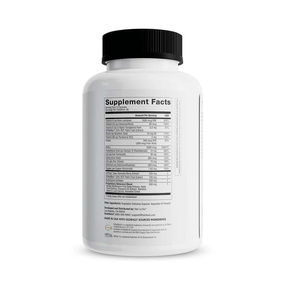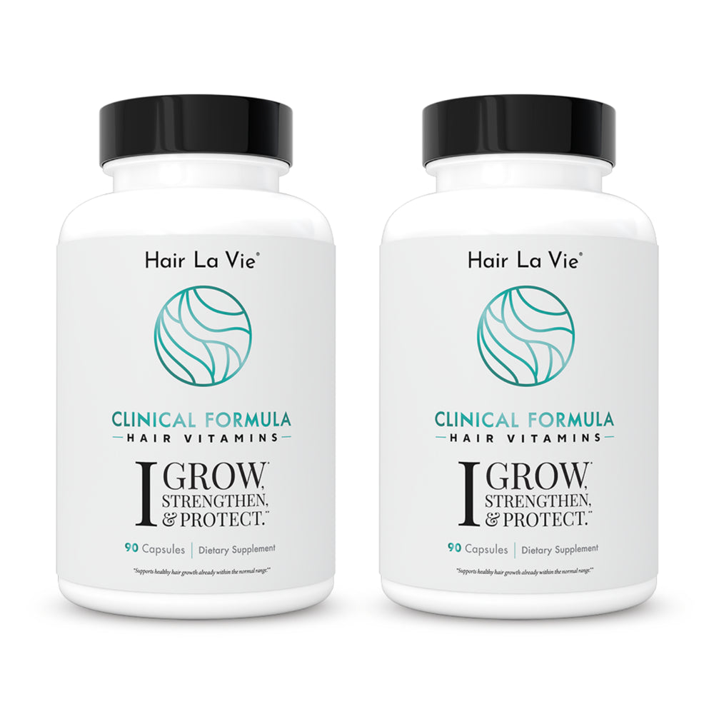 Gorgeous, healthy hair begins with whole-body wellness.** Hair La Vie’s Clinical Formula Hair Vitamins contain holistic ingredients to revitalize the length, strength, volume, and shine of your hair.** Give your hair, skin, and nails the support they deserve with essential hair vitamins and minerals + a powerful, naturally derived botanical blend of preservative-free, cruelty-free, and non-GMO ingredients..** With Hydrolyzed Collagen, USPlus Saw Palmetto, and 5000 mcg of Biotin, Clinical Formula Hair Vitamins nourish at the follicle level to promote strong, voluminous, long, and beautiful-looking hair.** Immune system supporting ingredients like Zinc, Vitamin A, Vitamin D, and Selenium target the root causes of typical stress within the body to target signs of everyday hair shedding.** With glowing press reviews from Oprah Daily, Elle, Who What Wear and Forbes, it’s no secret that Hair La Vie’s Clinical Formula Hair Vitamins are your hair’s best ally in effortlessly achieving stunning volume, incredible shine, and renewed strength.** Join thousands of loyal Hair La Vie customers to grow, strengthen, and protect your hair with the power of total-body nutrition.** Hair La Vie’s products are formulated for success across all hair types. Each bottle contains 90 capsules, a 30-day supply of hair-supporting vitamins.** As with any supplement, consistency and time will yield the best results.