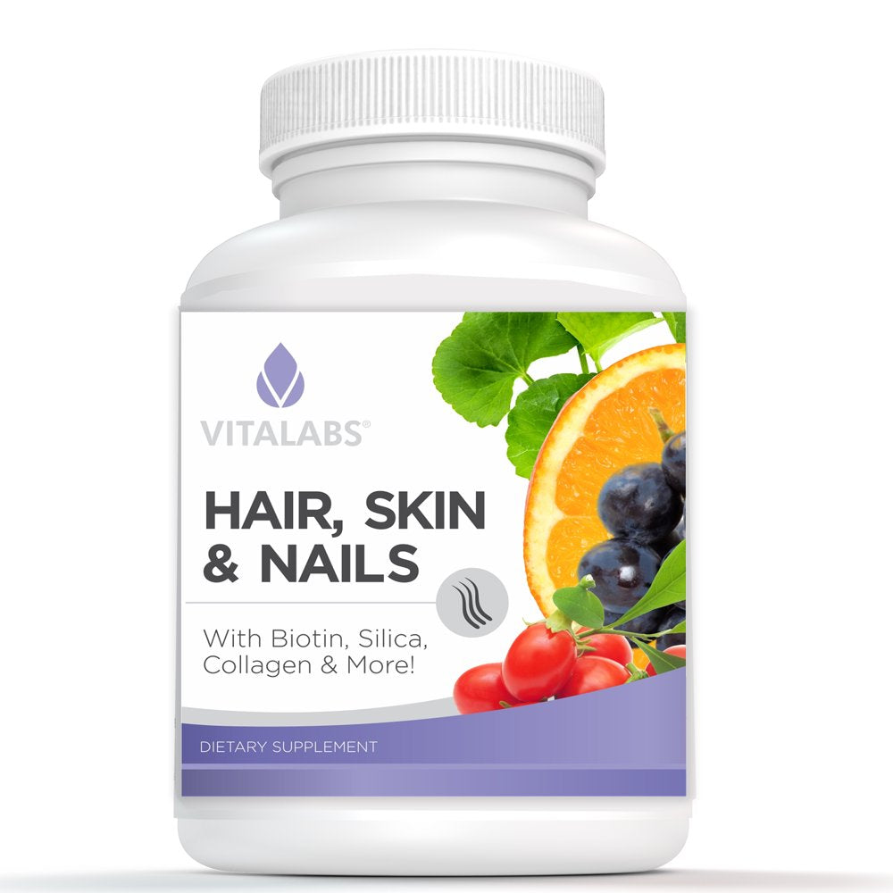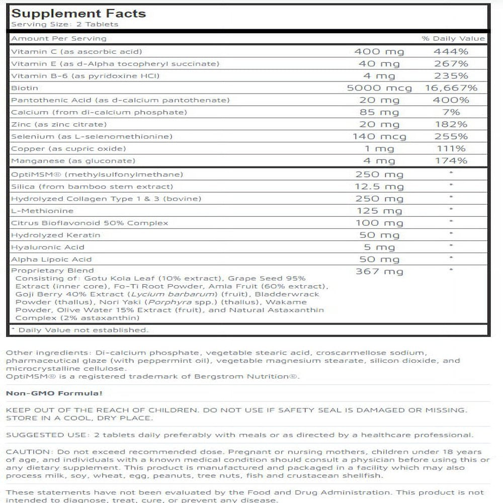 Biotin 5000 mcg Vitamin C (as ascorbic acid) 400 mg Vitamin E (as d-Alpha tocopheryl succinate) 40 mg Vitamin B-6 (as pyridoxine HCl) 4 mg Pantothenic Acid (as d-calcium pantothenate) 20 mg Calcium (from di-calcium phosphate) 85 mg Zinc (as zinc citrate) 20 mg Selenium (as L-selenomethionine) 140 mcg Copper (as cupric oxide) 1 mg Manganese (as gluconate) 4 mg OptiMSM® (methylsulfonylmethane) 250 mg Silica (from bamboo stem extract) 12.5 mg Hydrolyzed Collagen Type 1 & 3 (bovine) 250 mg L-Methionine 125 mg Citrus Bioflavonoid 50% Complex 100 mg Hydrolyzed Keratin 50 mg Hyaluronic Acid 5 mg Alpha Lipoic Acid 50 mg Proprietary Blend Consisting of: Gotu Kola Leaf (10% extract), Grape Seed 95% Extract (inner core), Fo-Ti Root Powder, Amla Fruit (60% extract), Goji Berry 40% Extract (Lycium barbarum) (fruit), Bladderwrack Powder (thallus), Nori Yaki (Porphyra spp.) (thallus), Wakame Powder, Olive Water 15% Extract (fruit), and Natural Astaxanthin Complex (2% astaxanthin) 367mg/div>