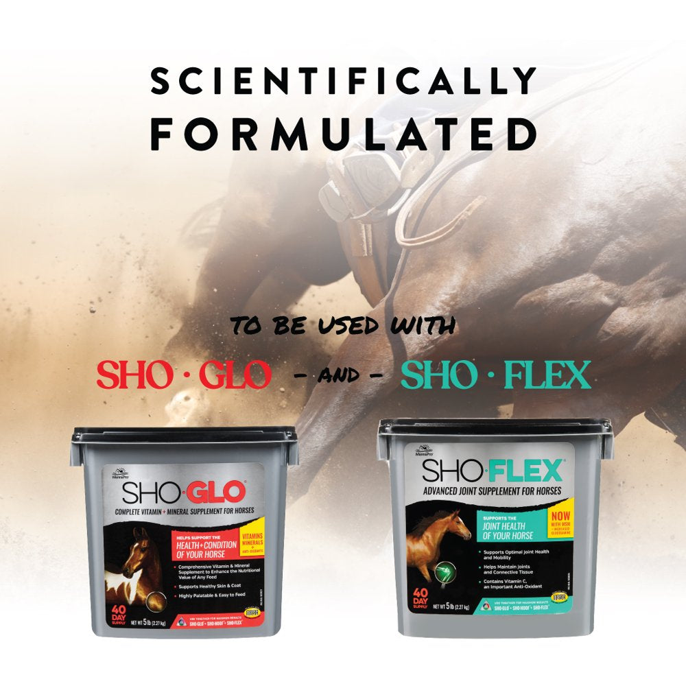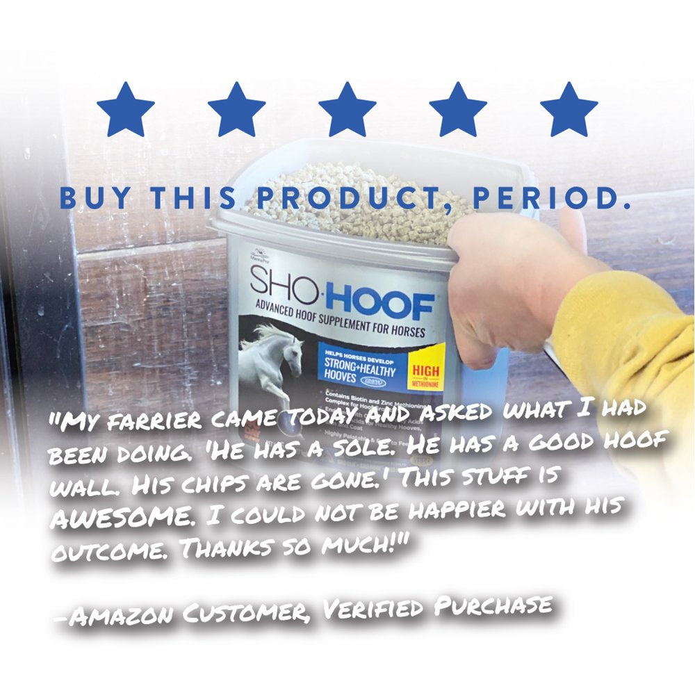 As the saying goes: no hoof, no horse! Maintaining hoof strength and soundness is crucial to keeping a happy and healthy horse. With Manna Pro Sho-Hoof, you know you're giving scientifically-proven levels of the best ingredients for your horses' hooves. Manna Pro Sho-Hoof is an advanced supplement for horses to help promote strong and healthy hooves, skin and coat. Sho-Hoof contains 20mg of Biotin, which is the optimal daily amount recommended to help maintain hoof condition. Additionally, it contains 8,500mg of Methionine and 187mg of Chelated Zinc, which assist in overall hoof soundness. Top that off with added Omega-3 fatty acids and amino acids, and you have a well-rounded hoof, skin, and coat supplement for your horse. This highly-palatable pelleted supplement is formulated to work together with Sho-Flex and Sho-Glo for advanced performance of hooves, skin, coat and joints, and is backed by our Happy Horse guarantee!