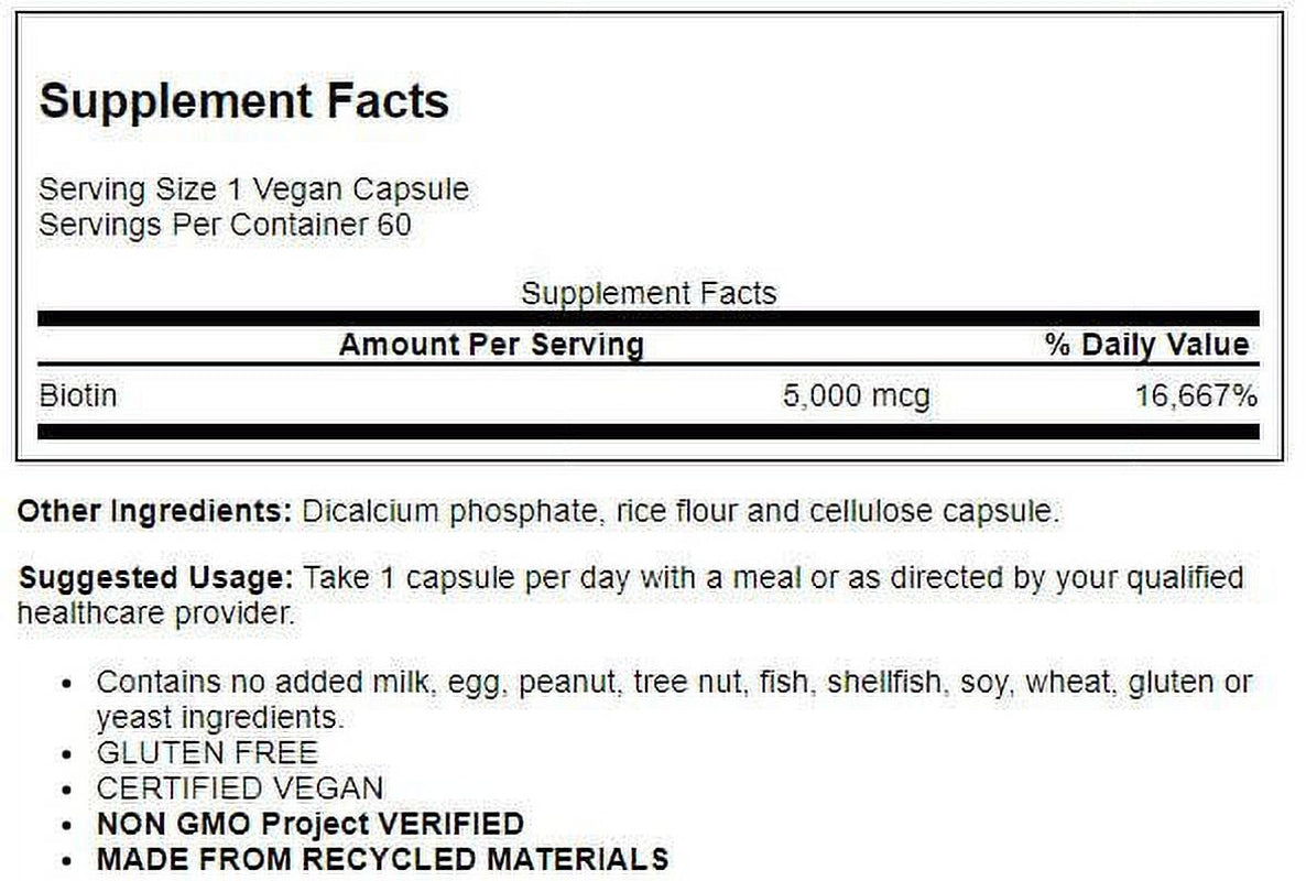 Hair, Skin & Nails Dietary Supplement Gluten Free Vegan Non GMO For Healthy Hair, Skin & Nails Supports Cellular Energy Biotin is a water soluble B vitamin found in foods such as oatmeal and assists in energy metabolism in cells. Biotin is essential for the metabolism of carbohydrates, proteins and fats. In addition, Biotin helps to support healthy skin, hair and nails.