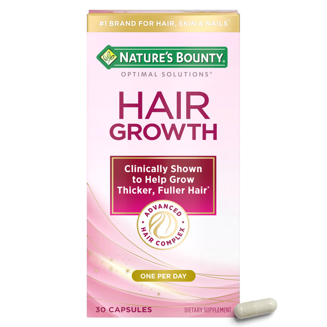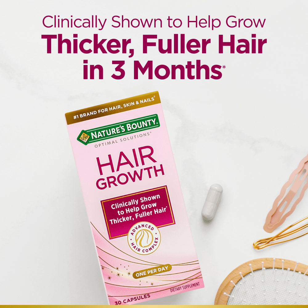 Nature’s Bounty® Optimal Solutions® Hair Growth with Advanced Hair Complex is clinically shown to help grow thicker, fuller hair in just three months.* As we age hair follicles can change, making hair appear less thick and healthy. From the #1 Brand For Hair, Skin & Nails◊ , Nature’s Bounty® Optimal Solutions® Hair Growth contains ADVANCED HAIR COMPLEX with vital nutrients that nourish the hair follicles to help grow thicker, fuller hair.* Advanced Hair Complex contains Biotin, Silicon and Arginine, which provide structural support for existing hair growth and increased thickness —in a convenient one-per-day formula.* You’ll love the competitive price, compared to other brands of hair growth pills. To help fit dietary and lifestyle preferences, Nature’s Bounty® Optimal Solutions® Hair Growth is non-GMO, gelatin-free, and suitable for vegetarians. Like all Nature’s Bounty products, our hair growth supplement is backed by 50 years of quality, science, and great ingredients—guaranteed. Each bottle contains 30 capsules, a one-month supply.