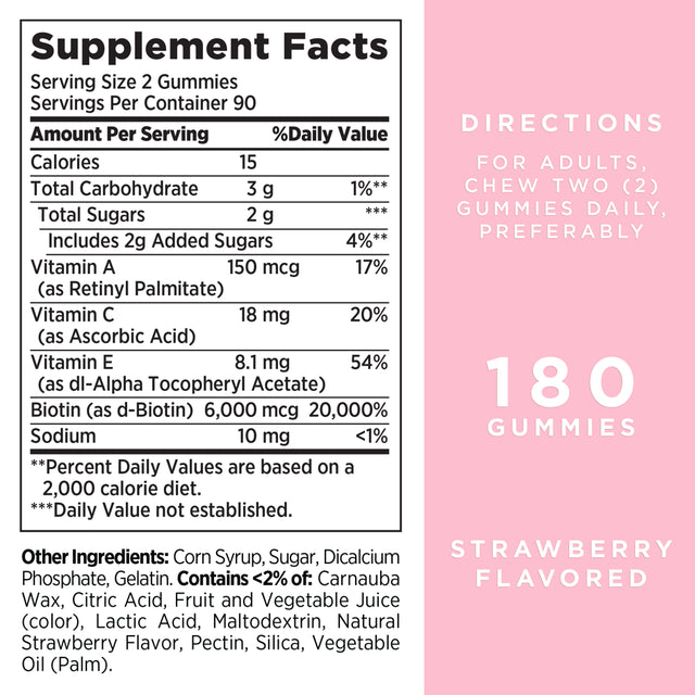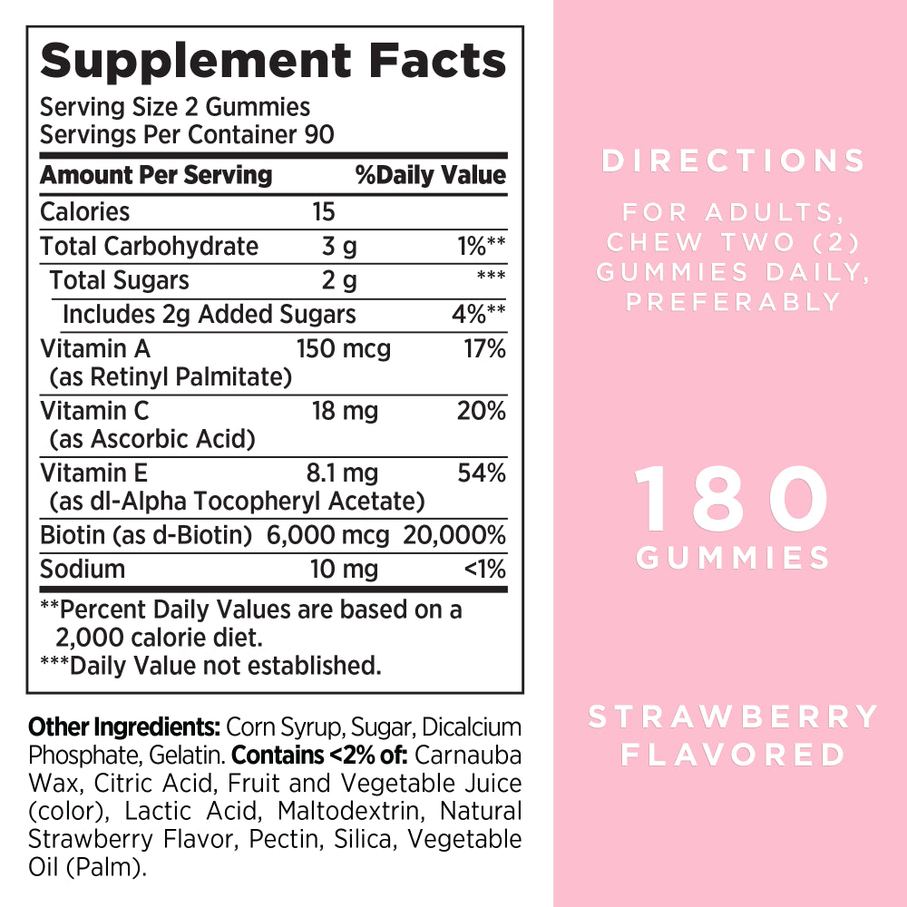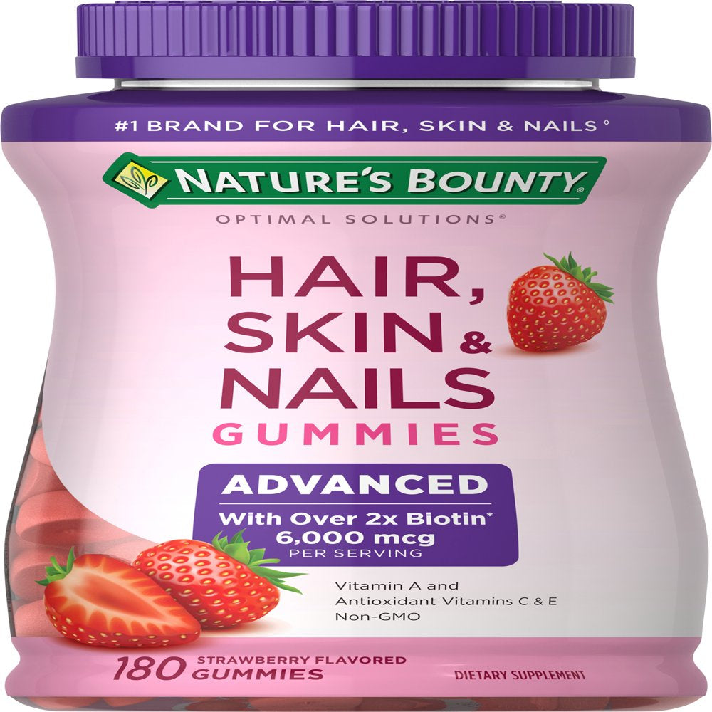 Give your beauty routine an upgrade with new Nature’s Bounty® Advanced Hair Skin & Nails Gummies! Packed with 2x the amount of Biotin as our leading Hair, Skin & Nails gummy formula, each serving contains 6,000mcg of Biotin to support beautiful hair, glowing skin, and healthy nails.* Bursting with the same delicious strawberry flavor as our original Hair, Skin & Nails Gummies, our Advanced formula is Non-GMO and now includes Vitamin A which plays an essential role in maintaining skin health.* Our Advanced Hair, Skin & Nails Gummies also contain antioxidants Vitamin C and Vitamin E. Vitamin C is involved in the production and formation of collagen, acting as the basis for vibrant skin, while Vitamin E is a nutrient that is found on the outermost skin surface.* As an added bonus, our delicious gummies are and made from naturally sourced colors and flavors, making them the perfect supplement to your beauty regimen from the #1 Brand for Hair, Skin & Nails.*◊ Packaging may vary.