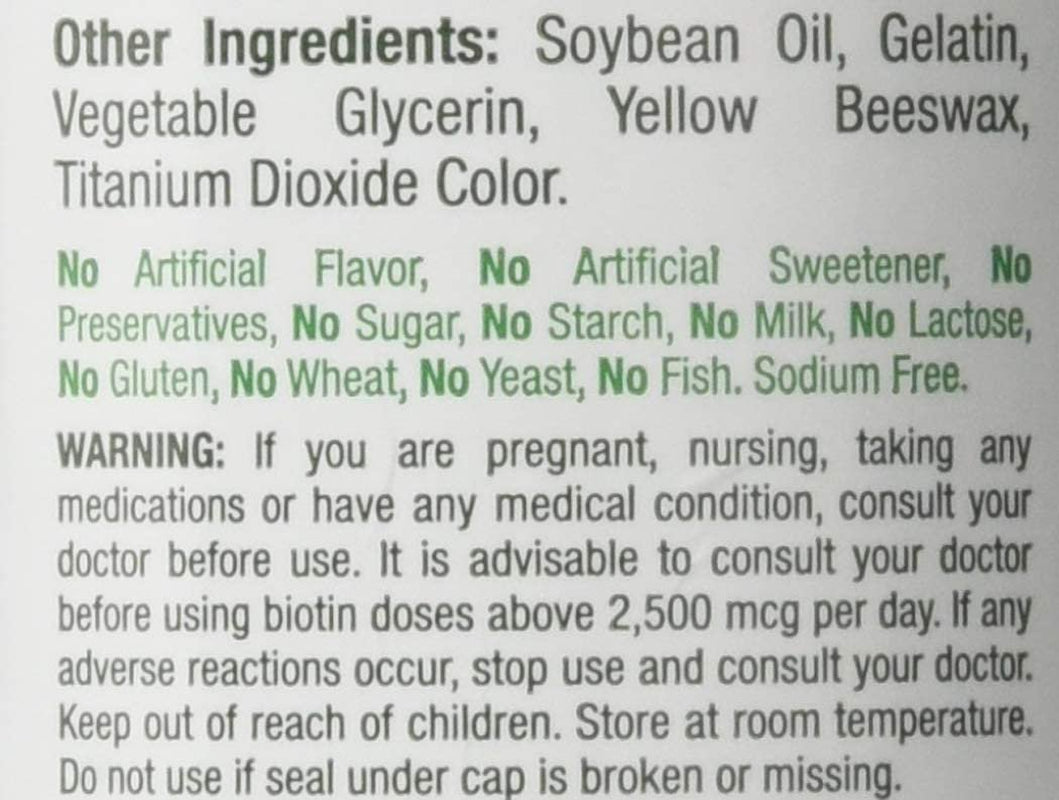 Heading Purpose Dietary Supplement Manufacturer Us Nutrition Active Ingredients 1 Softgel: Biotin (d-Biotin) 10000 mcg; Soybean Oil; Gelatin; Vegetable Glycerin; Yellow Beeswax; Titanium Dioxide Color Directions For adults, take one (1) softgel daily, preferably with a meal. Uses Biotin supports the metabolism of carbohydrates, fats and proteins for energy use.* Ultra strength is designed to provide ample amounts of this essential nutrient to maximize benefits.* Also helps to support healthy skin and hair.*No artificial flavor or sweetener. No preservatives, sugar, starch, milk, lactose, gluten, wheat, yeast or fish. Sodium free. *These statements have not been evaluated by the Food and Drug Administration. This product is not intended to diagnose, treat, cure or prevent any disease. Warnings If you are pregnant, nursing, taking any medications or have any medical condition, consult your doctor before use. Discontinue use and consult your doctor if any adverse reactions occur. Keep out of reach of children. Store at room temperature. hide