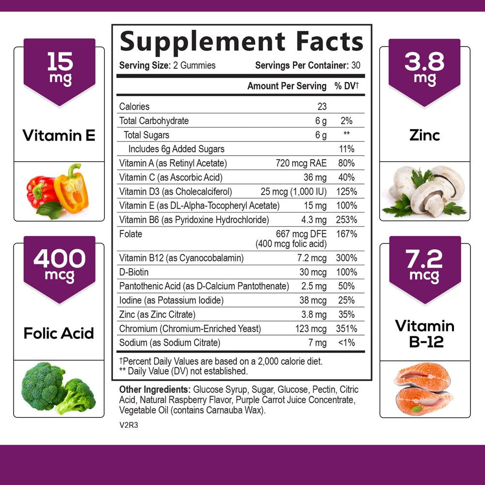 Adult Multivitamin Gummies Extra Strength Immune Support - Natural Complete Daily Gummy Vitamin Supplement - Vegetarian Multi with Vitamins A, C, E, B6, B12 for Men and Women, Non-GmoSupplement Facts (per 2 Gummies):Vitamin A (Retinyl Acetate): 243 iuVita C (Ascorbic Acid): 36 mgVitamin D3 (Cholecalciferol): 1000 iuVitamin E (Dl Alpha Tocopheryl Acetate): 15 mgVitamin B6 (as PyridoxineHydrochloride): 4.3 mcgVitamin B12(Cyanocobalamin): 7.2 mcgFolate: 400 mcgBiotin: 30 mcgPanthothenic Acid: 2.5 mgZinc: 2.2 mgIodine: 38 mcgZinc: 3.8 mgChromium: 123 mcgOther Ingredients: Glucose Syrup, Sugar, Glucose, Pectin, Citric Acid, Sodium Citrate, Natural Raspberry Flavor, Vegetable Oil (contains Carnauba Wax), Purple Carrot Juice Concentrate.Each batch is proudly manufactured and bottled in a facility following strict cGmp guidelines. For quality assurance, it is third party tested for purity and quality by an experienced dietary supplement laboratory.