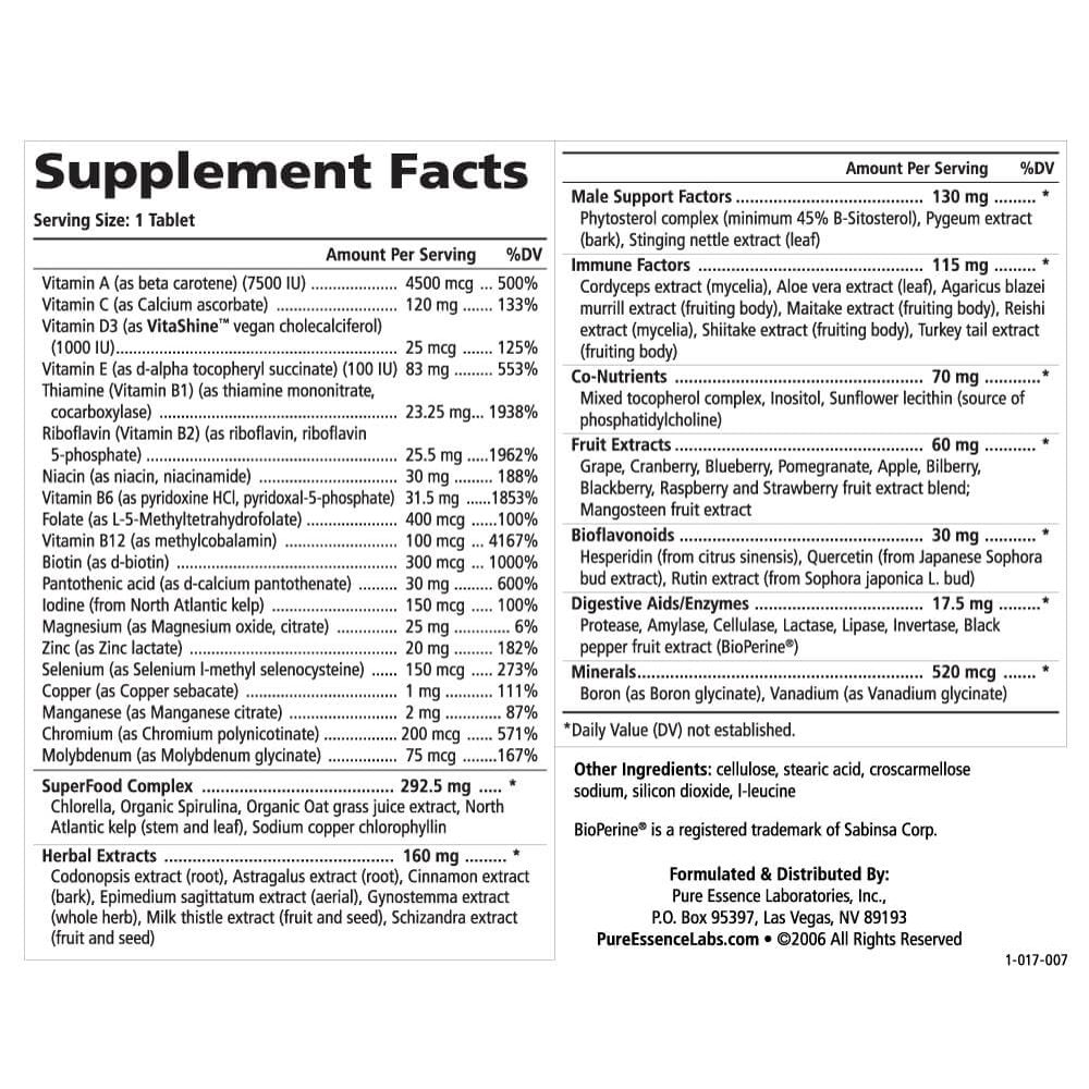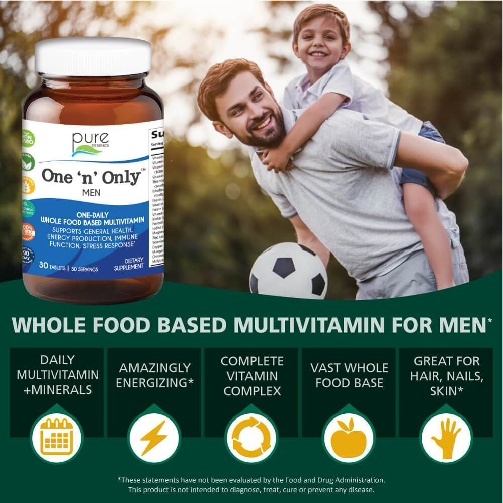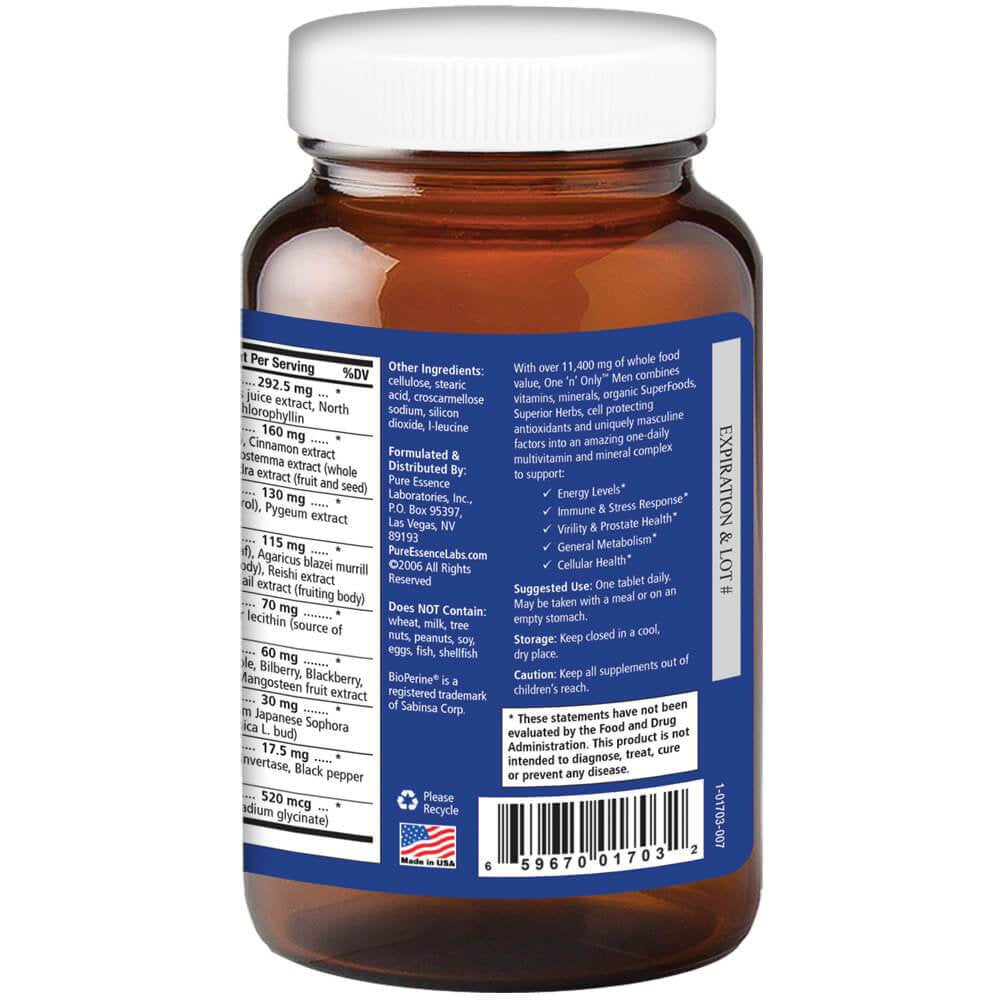 Pure Essence Labs - One 'n' Only Men's Formula - 30 TabletsPure Essence Labs One 'n' Only Men's Formula is for men in reasonably good health, who eat at least a reasonably good diet. Five years ago, Pure Essence introduced their One ‘n’ Only Men’s Formula. With slightly higher levels of vitamins and minerals than other formulas, its real power was in its whole food base. It contained over 10,000 mg of whole food value per serving, 20 times more than any other men’s one daily provides.