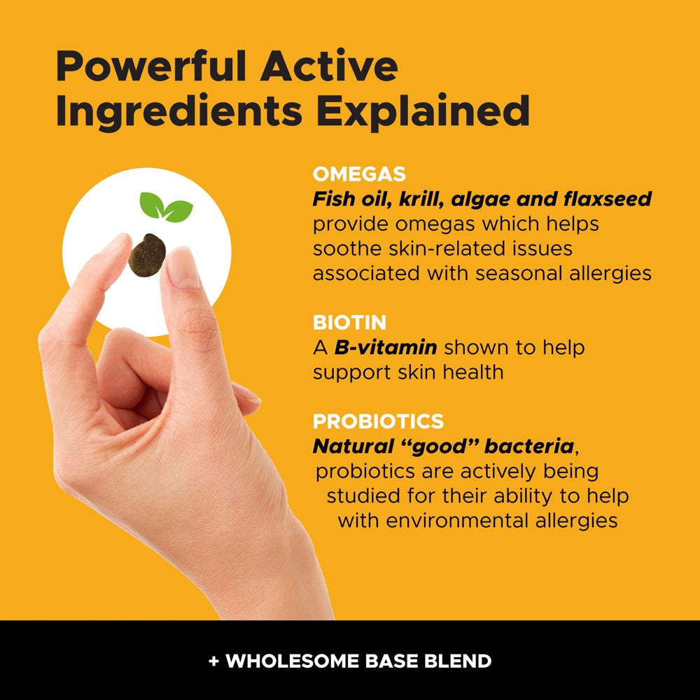• MADE WITH NATURAL & OTHER PREMIUM INGREDIENTS LIKE OMEGAS, BIOTIN and PROBIOTICS: Allergy Skin Health Max Strength chews are filled with health-supporting ingredients you can trust. Omegas help soothe skin issues associated with seasonal allergies. Biotin is a B vitamin that helps support skin health. Probiotics support gut and immune health and promote nutrient absorption and healthy inflammatory pathways for healthier skin and histamine response.