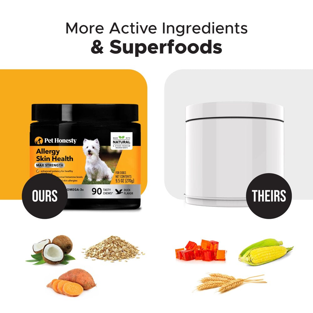 • BUILT ON OUR EXCLUSIVE NATURAL PURE VITALITY BLEND: Allergy Skin Health Max Strength is formulated with our Pure Vitality BlendTM, made with natural ingredients you can find in your own pantry. We combine this nutritious blend with powerful, research-backed active ingredients to best support your dog where they need it most. Our chews promote healthy skin, help soothe seasonal allergy-related skin issues, and support healthy digestion. Your dog will absolutely love the delicious duck flavor!