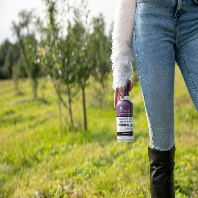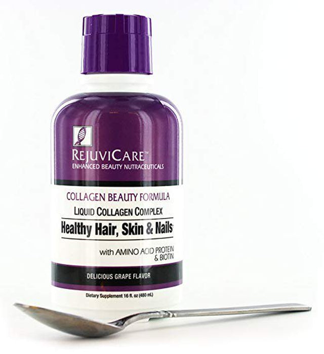 From your skin and hair to your bones and joints, collagen is the most abundant protein in the human body . . . and now it's your next health and beauty secret. Rejuvicare Liquid Collagen Beauty Formula combines collagen peptides with biotin and amino acids to create an advanced supplement that helps revitalize skin, strengthens nails and adds shine and life to your hair. Collagen’s amino acids also help maintain elasticity and encourage development of strong connective tissue. If you've ever considered treatments to revitalize your skin or hair, put them on hold until you've tried Rejuvicare Liquid Collagen Beauty Formula. Rejuvicare is a natural beauty supplement line designed to help you look your best, from the inside out.Rejuvicare Liquid Collagen Beauty Formula provides a delicious, convenient way to supplement with 500 mg of pure collagen peptides, plus 1,000 mcg of biotin in every serving. Enjoy this great tasting grape flavor liquid on a daily basis. Each 1 tablespoon serving provides the highest quality collagen to help boost skin, nail, hair and joint health.Collagen is an important protein that provides the building blocks for beautiful and healthy skin, nails and hair. Collagen makes up nearly 80% of skin and supplies structure, elasticity and retention of moisture within the skin. As a result, your body needs collagen in order to stimulate normal growth of healthy cells. This not only relates to improved vitality for skin, but also for healthy and stronger nails, hair, connective tissue and joints. Meanwhile, biotin promotes thicker and stronger hair, while supporting healthy and strong nails.Rejuvicare Liquid Collagen provides the building blocks for beautiful and healthy hair, skin and nails. This easy-to-use supplement gives you highly effective collagen hydrolysate and biotin to support skin repair, hydration and overall health, in a convenient and delicious liquid. Look your best with Rejuvicare Liquid Collagen Beauty Formula!