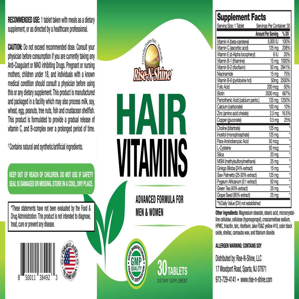 Hair Vitamins by Rise-N-Shine, 30 count, is a hair growth supplement for Men and Women and provides a well-balanced blend of important nutrients that have been recognized for supporting healthy, thick, full hair. This powerful formula is made with Biotin, PABA, and Saw Palmetto. Our formula also, contains Vitamin A, Vitamin C, Vitamin E, Vitamin B-1, Niacinamide, Vitamin B-6, Folic Acid, Biotin, Pantothenic Acid, PABA, Zinc, Copper, Choline, Silica, MSM, Ginkgo Biloba, Saw Palmetto, Pygeum Africanum, Green Tea, Grape Seed and more!