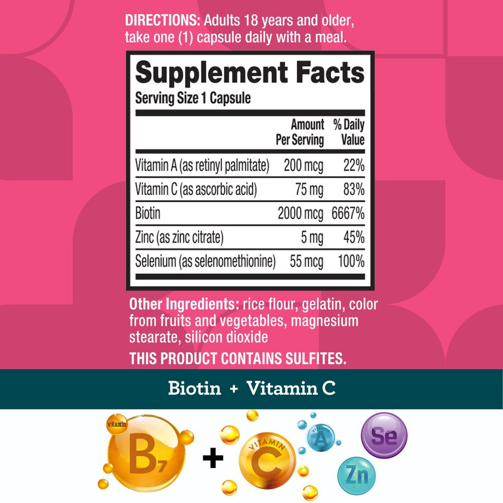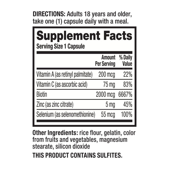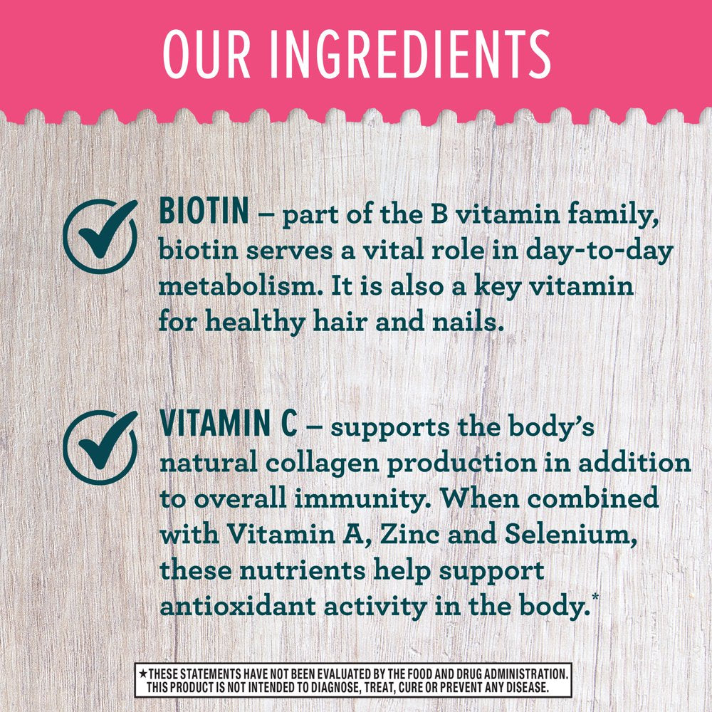• IMPORTANT CALLOUTS: Biotin + Vitamin C not only supports hair, skin & nails, but it also supports natural collagen production and with our combination of nutrients it helps support a healthy appearance.٭ This product is NON-GMO, GLUTEN-FREE, and has colors from natural sources. Please note that this product contains sulfites.