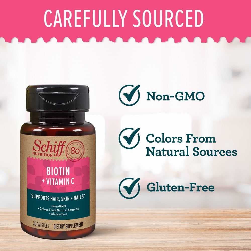 • HIGH QUALITY INGREDIENTS: At Schiff we use only high quality ingredients. These BIOTIN + VITAMIN C capsules are GLUTEN-FREE, NON-GMO, and have colors from natural sources. We've specially crafted this product to have high quality ingredients that you can trust.