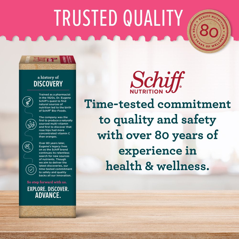 • A BRAND YOU CAN TRUST: Dr. Eugene Schiff began his quest to find natural sources of nutrition over 80 years ago and Schiff was the first company to produce a naturally sourced multi-vitamin. Eugene's legacy lives on as the Schiff brand continues its relentless search for new sources of nutrients. Our commitment to safety & quality backs all our innovation. We guarantee ALL our products' purity, freshness and labeled potency.