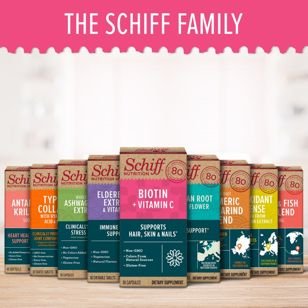 All NEW from Schiff comes Biotin + Vitamin C. We've specially crafted this product to have high quality ingredients which you can trust. Schiff Biotin + Vitamin C not only supports hair, skin & nails, but it also supports natural collagen production and with our combination of nutrients it helps support a healthy appearance.٭At Schiff we use only high quality ingredients. These Biotin + Vitamin C capsules are GLUTEN-FREE, NON-GMO, and only use colors from natural sources.Why Schiff Biotin + Vitamin C? Part of the Vitamin B family, Biotin serves a vital role in day-to-day metabolism. It is also a key vitamin needed for healthy hair, skin and nails.٭Why Is It Blended With Vitamins C & A and Minerals Zinc & Selenium? Vitamin C supports the body’s natural collagen production in addition to overall immunity. When combined with Vitamin A, Zinc and Selenium, these nutrients help support antioxidant activity in the body.٭The box that holds your Schiff Biotin + Vitamin C is made from post-consumer recycled natural kraft paper, which is also 100% recyclable & compostable. At Schiff we value the environment and know you do as well. It is our commitment to provide sustainable solutions to protect the future for EVERYONE.Why Schiff? Trained as a pharmacist in the 1920's, Dr. Eugene Schiff's quest to find natural sources of nutrition led to the birth of Schiff Bio-Foods. The company was the first to produce a naturally sourced multi-vitamin and first to discover that rose hips had more concentrated Vitamin C than oranges. Over 80 years later, Eugene's legacy lives on as the Schiff brand continues its relentless search for new sources of nutrients. Though we aim to deliver the latest discoveries, our time-tested commitment to safety & quality backs all our innovation. So, step forward with us. EXPLORE. DISCOVER. ADVANCE.٭THESE STATEMENTS HAVE NOT BEEN EVALUATED BY THE FOOD AND DRUG ADMINISTRATION. THIS PRODUCT IS NOT INTENDED TO DIAGNOSE, TREAT, CURE OR PREVENT ANY DISEASE.