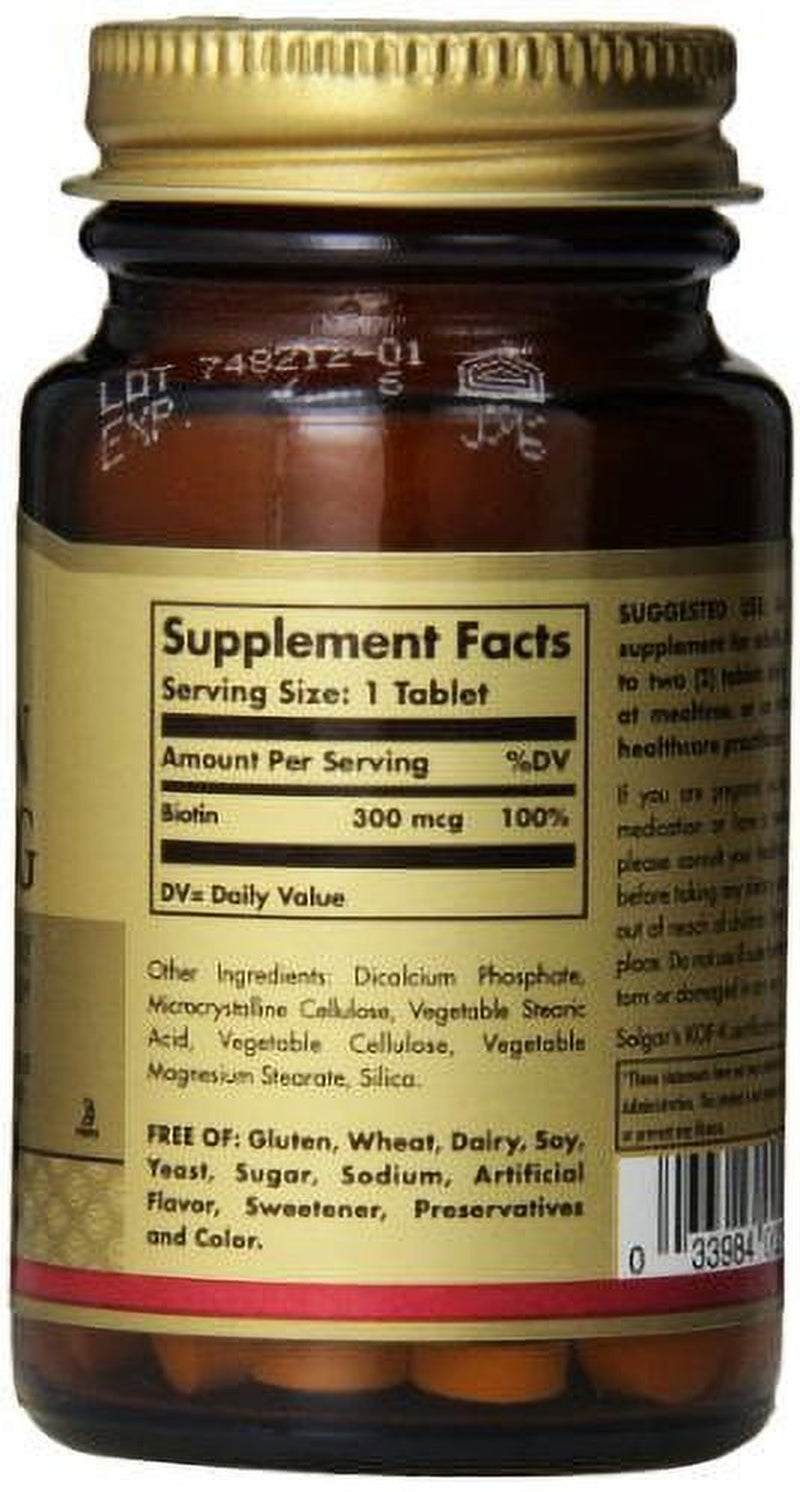 Serving Size 1 Tablet Servings Per Container 100 Amount Per Serving% Daily Value*** Biotin 300 mcg 100% ***Percent Daily Values are based on a 2,000 calorie diet Ingredients: Dicalcium Phosphate, Microcrystalline Cellulose, Vegetable Stearic Acid, Vegetable Cellulose, Vegetable Magnesium Stearate, Silica./div>