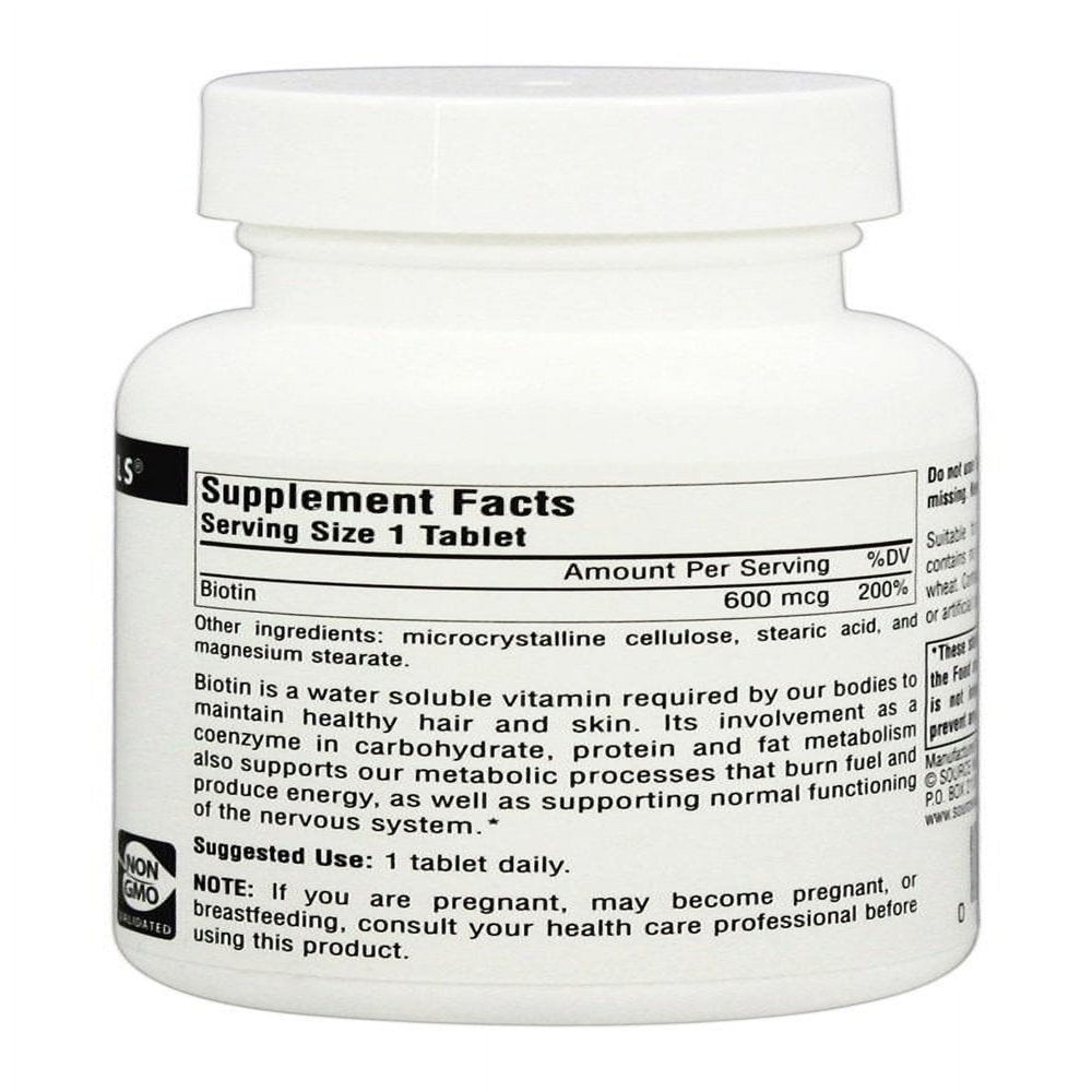 The supplement may also support the health of the skin‚ nerves‚ digestive tract‚ and cells. Biotin 600 mcg 100 Tablets from Source Naturals is suitable for vegetarians‚ is hypoallergenic‚ and is free of yeast‚ dairy‚ egg‚ gluten‚ corn‚ soy‚ wheat‚ sugar‚ starch‚ salt‚ preservatives‚ artificial color‚ flavor‚ or fragrance.