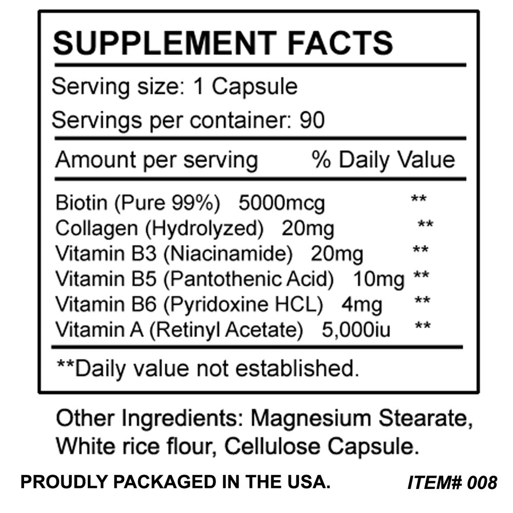 Biotin 5,000 mcg Collagen 20 mg Vitamin B3 20 mg Vitamin B5 10 mg Vitamin B6 4 mg Vitamin A 5000 iu/div>