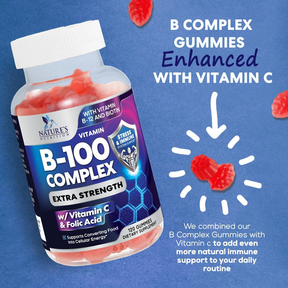 Super B Complex Gummies with Vitamin C & Folic Acid, Extra Strength Vitamin B Gummy Supplement with Niacin, B6, Folic Acid, B12, Biotin, Nature'S Energy Immune Support Supplements - 120 Gummies