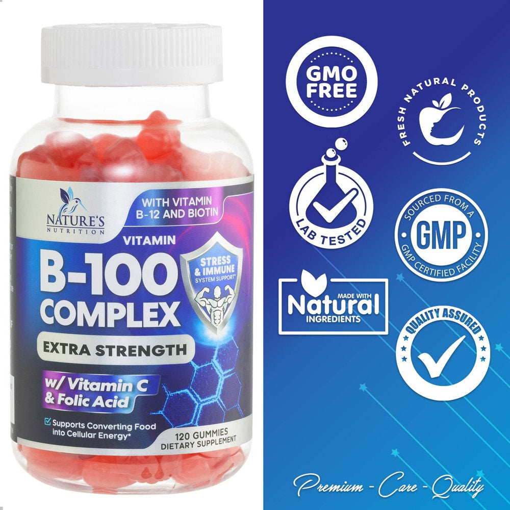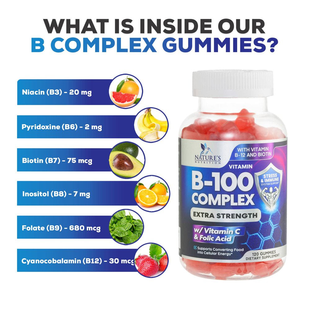 - Extra Strength 6 B Vitamin Complex: Our Nature's Nutrition B Complex Gummies contain 6 essential B vitamins; Niacin, B6, Folic Acid, B12, Biotin & Pantothenic Acid