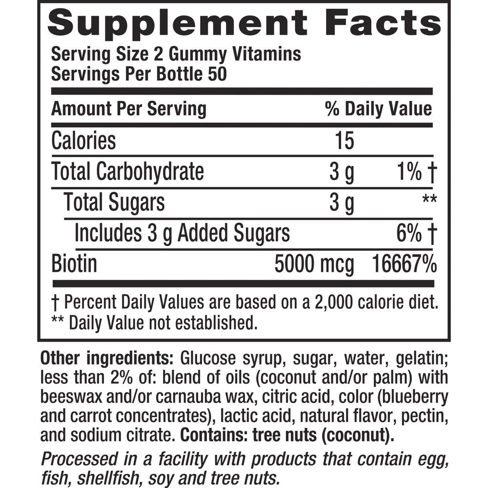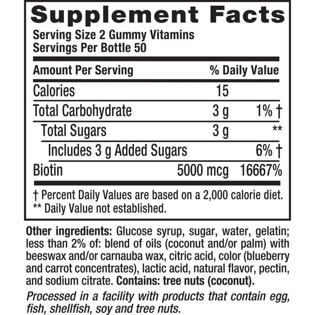 - Each two-gummy serving of these Biotin vitamin gummies provides 5,000 mcg of Biotin, 16,667 percent of the recommended daily value