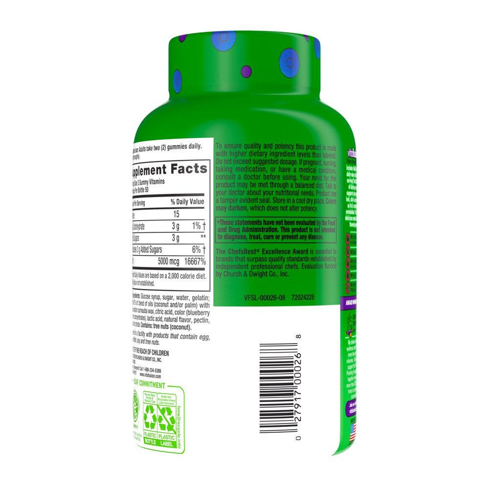 Vitafusion Extra Strength Biotin Gummy Vitamins contain high-potency Biotin vitamins fused into delicious gummies. Each delicious two-gummy serving provides a great-tasting and convenient alternative to traditional, hard-to-swallow vitamin pills. Vitafusion believes that taste and nutrition can be fused together, ensuring that taking your dietary supplements is an easy and delicious part of your day. Each serving of these adult gummy vitamins provides 5,000 mcg of Biotin, 16,667 percent of the recommended daily value, to support hair, skin and nails, along with fat, protein and carbohydrate metabolism (1). These flavorful and nutritious vitamin gummies are made with no artificial flavors or sweeteners, no gluten, no high-fructose corn syrup, no dairy and no synthetic FD&C dyes. The 100-count bottle of Biotin supplements ensures you’ll have enough to last 50 days. Vitafusion is the only gummy vitamin brand with products that have been awarded the ChefsBest Excellence award for taste; these Biotin vitamin gummies were the recipient of the 2018 ChefsBest Excellence Award (2). Take a fruitful step toward a healthier, happier world with America’s #1 Gummy Vitamin Brand.(1) These statements have not been evaluated by the Food and Drug Administration. This product is not intended to diagnose, treat, cure or prevent any disease. (2) The ChefsBest Excellence Award is awarded to brands that surpass quality standards established by independent professional chefs. Evaluation funded by Church & Dwight Co., Inc.