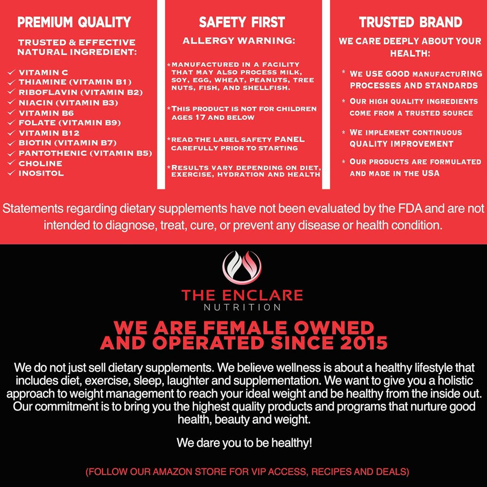 • Replenish with Complete Daily B-Complex Capsules: The B-complex group are water-soluble vitamins so it needs to be replenished everyday. Because our bodies use B vitamins every day, it is not always possible to get enough of all 8 b vitamins through diet alone. Take Enclare b-vitamin supplement to boost immune health, support digestion, improve mood, and increase energy.