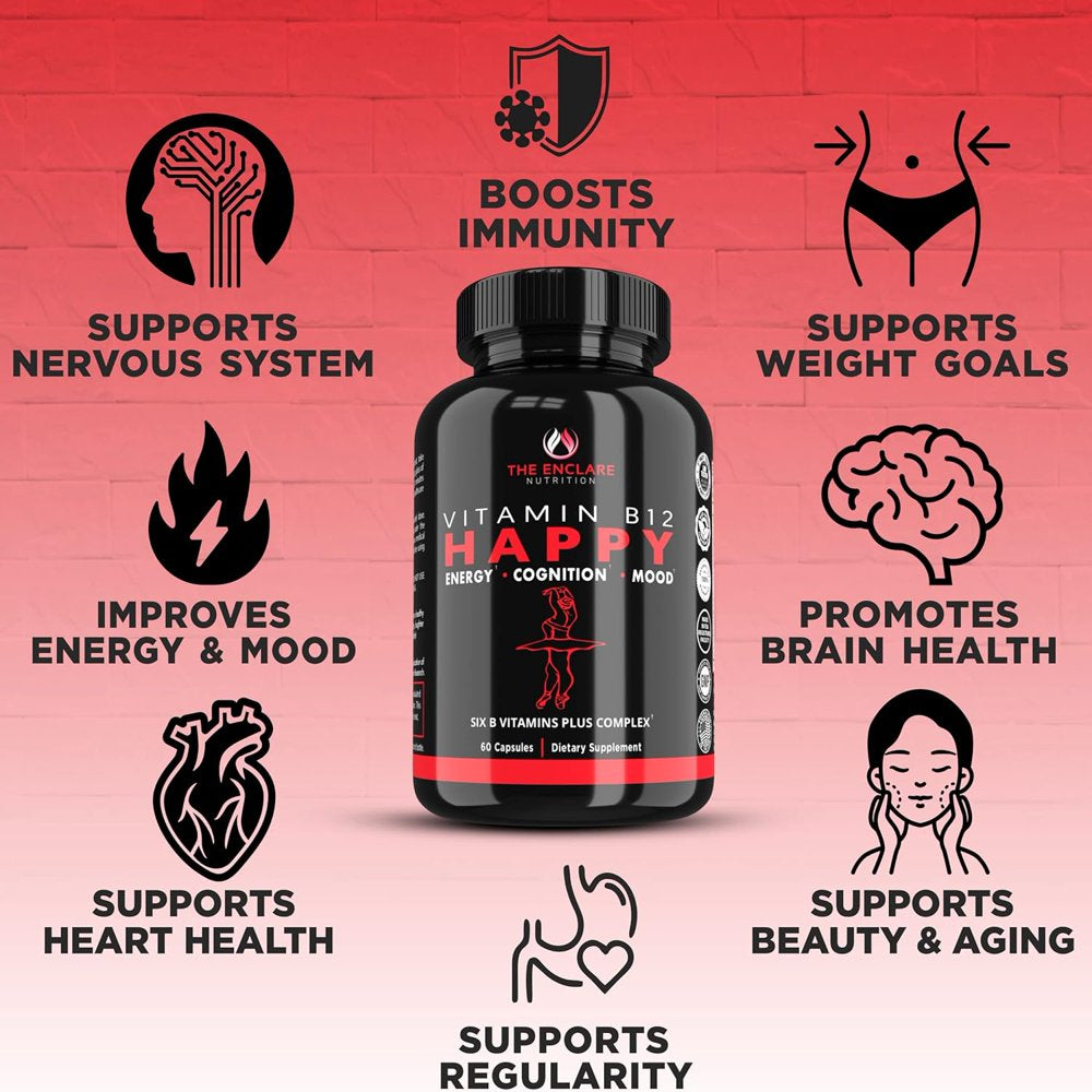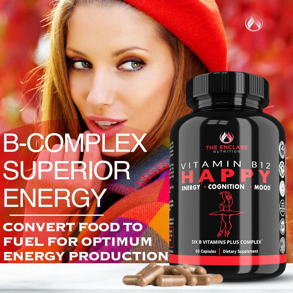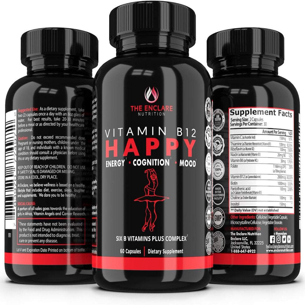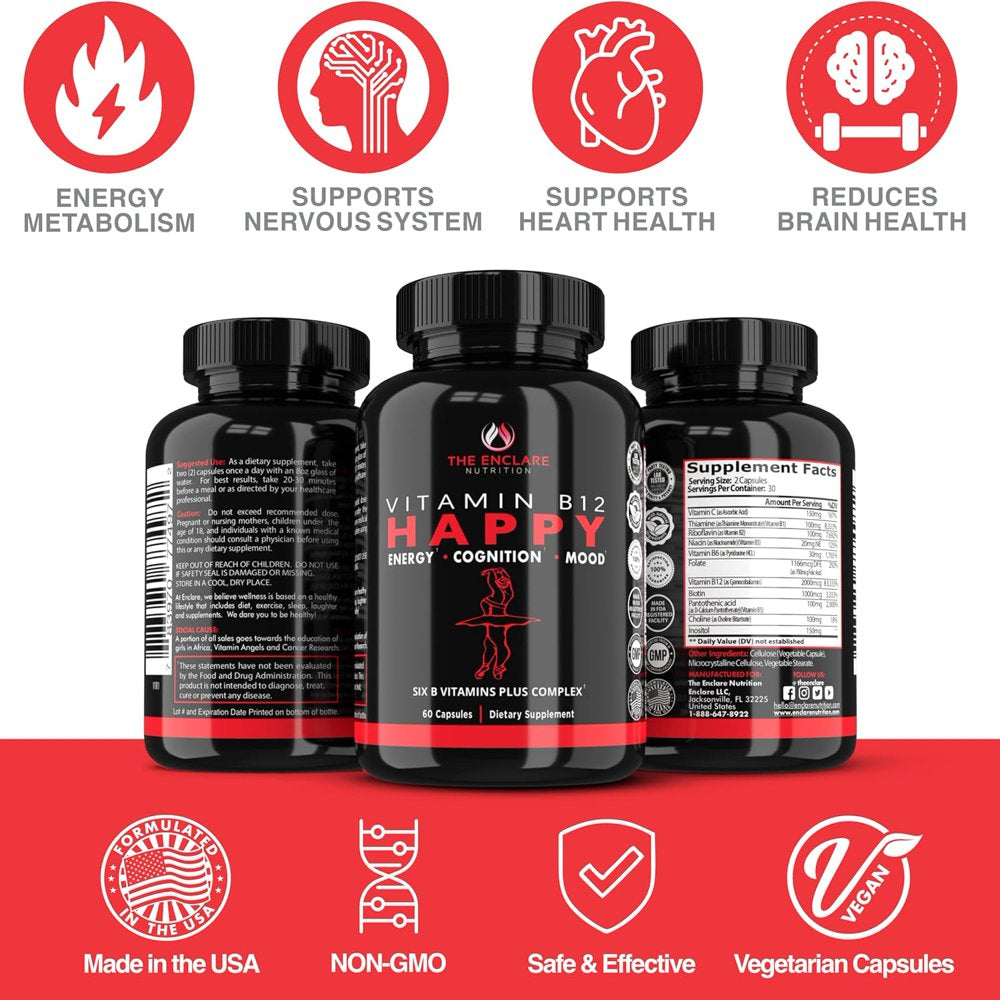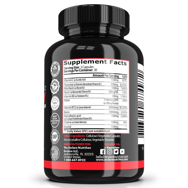 • Boost your brain, heart, and nervous system health with Enclare Vitamin B12 Complex 2000mcg, 60 ct. Our Vitamin B Complex contains all B Vitamins in one capsule - B1, B2, B3, B5, B6, B7, B9, B12 that play an essential role in overall health and wellbeing. B-vitamins help maintain the normal functioning of our bodies, promotes tissue health, and provides energy metabolism support.*