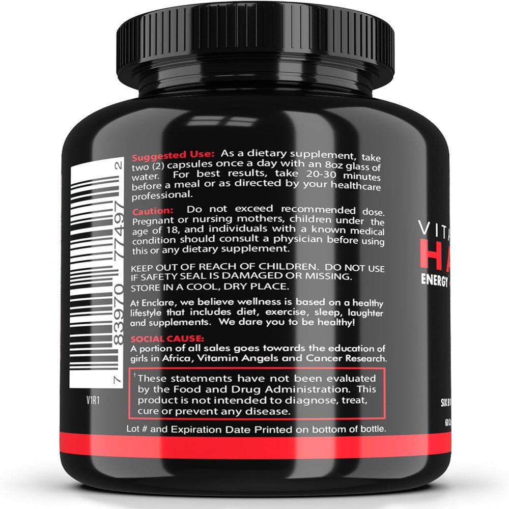 Our superior Vitamin B Complex is a powerful combination of essential B vitamins and key nutrients that promote optimal health and wellness. This B Vitamins formula includes Vitamins B12, B6, Biotin, Folate (Folic Acid), Pantothenic Acid, Riboflavin, Niacin, Thiamine, Choline, Inositol, and Vitamin C, which play a vital role in supporting the body. These B12 Complex vegetarian capsules are made with vegan ingredients, easy to take and quick to absorb. ENCLARE NUTRITION B 12 complex is a pure, clean and natural formula. 1. Boosts energy levels and perform your best throughout the day. The B vitamins complex nutrients like vitamin B6, niacin, and pantothenic acid, and vitamin B12 promote energy metabolism. 2. Choline and Inositol help promote brain health and positive mood. B Complex formula supports cognitive function, clarity, memory and focus. 3. Thiamine and Riboflavin help promote healthy circulation and supports heart health. 4. Vitamin-B’s nutrients like Folate, Niacin, and Vitamin B6, support healthy nervous system function and promote nervous system health. 5. Enjoy hair, skin, and nails benefits with our b-complex beauty vitamins. B complex capsules help maintain healthy hair, skin, and nails. Vitamin C potent antioxidant, helps to promote healthy collagen production and skin appearance. 6. Niacin and Pantothenic Acid, in this vitamin b formula support healthy digestion. 7. Folate and Vitamin B6, Vitamin B-12 Complex promotes healthy immune function. Whether you're looking for more energy levels, better performance and immunity, B Complex vitamins can help. Add Enclare vitamin b supplements to your daily routine and enjoy healthy hair, skin, and nails, improved heart health, better cognition, mood, and digestion. Experience the benefits of our superior B-vitamin supplement for yourself today. All B Vitamins in one capsule - vitamin B1, vitamin B2, vitamin B3, vitamin B5, vitamin B6, vitamin B7, vitamin B9, vitamin B12. Order now and take the first step towards better health and wellness.