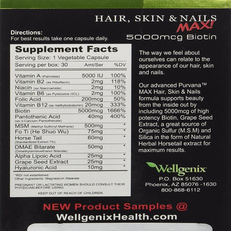Purvana MAX by Wellgenix 5000Mcg Biotin, 30 Vegetable Capsules (2 Pack)