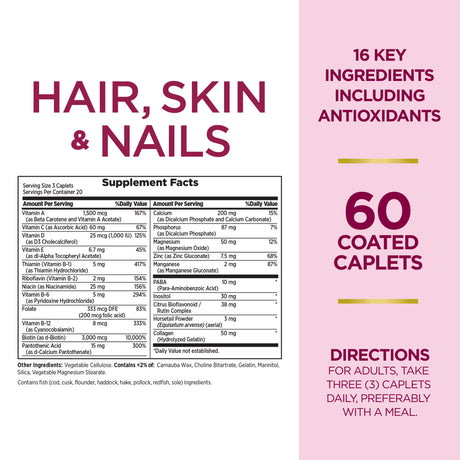 Nature'S Bounty Optimal Solutions Hair, Skin & Nail Vitamin Caplets with Biotin 3000 Mcg, 60 Ct