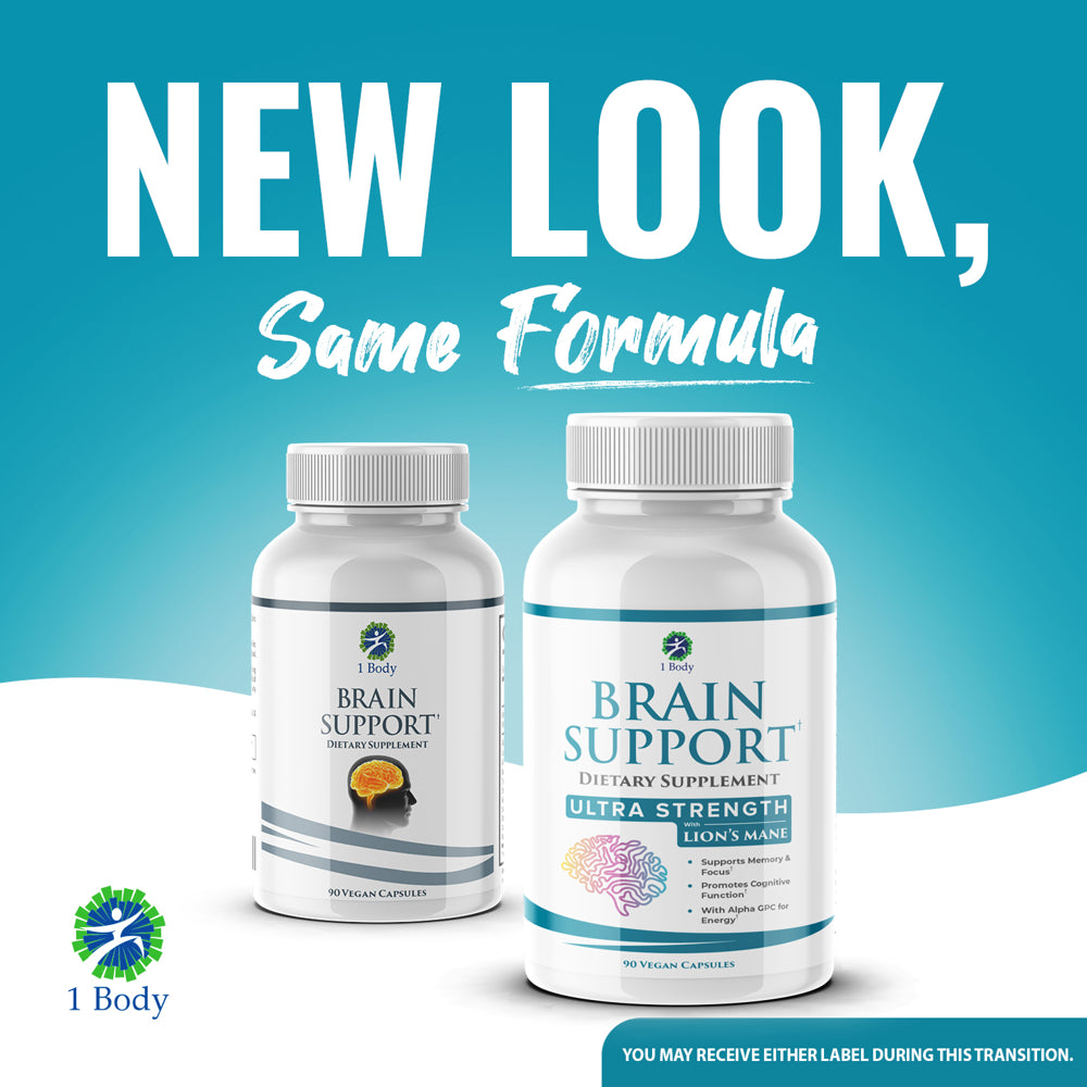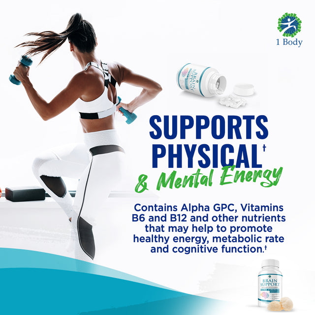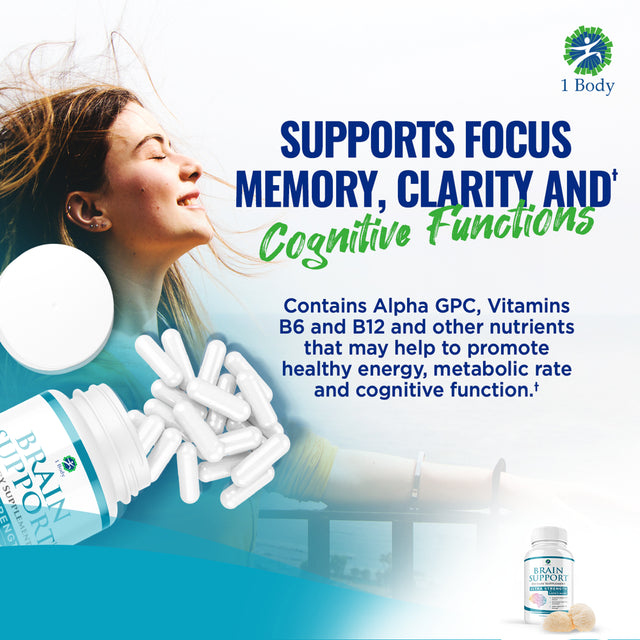 1 Body Brain Support Supplement boosts focus with a special blend of vitamins and nootropics such as Lion's Mane. These nourish your mind and promote better recall and memory retention to improve your communication skills, enhance learning and retain access to memories. Alpha GPC supports cognitive acuity while L-Theanine improves memory and cognitive function. Bacopa sharpens synaptic communication and cognition and huperzine A enhances memory and learning. Other ingredients in the focus booster supplement also include Phosphatidylserine, Ginkgo Biloba and Rhodiola Rosea. The supplement works without the need for caffeine or other stimulants, elevating serotonin and dopamine for a better mood. Pure ingredients deliver a non-GMO and vegan-friendly capsule that's soft and easy to swallow. Third-party tested, it's made in the USA in our GMP-certified facility. The energy and mood boosting supplement contains no food allergens such as soy, dairy or gluten and uses no artificial colors or flavors.