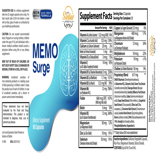 Memo Surge - Focus & Memory Support - 60 Capsules Memo Surge is a natural brain boosting nootropic. It nourishes the brain and may help improve memory. It restores the necessary chemical for the brain to survive and function better. The supplement rejuvenates and energizes the brain cells responsib