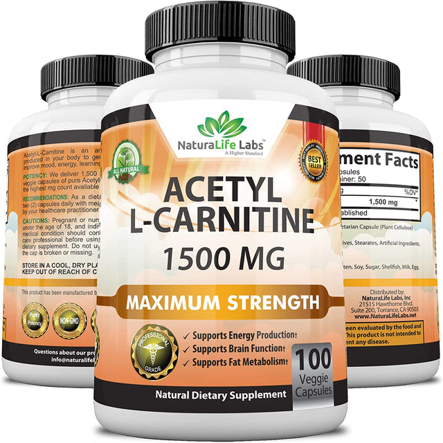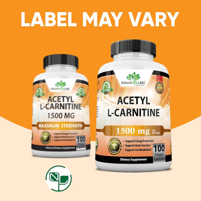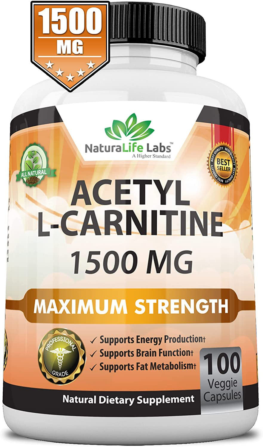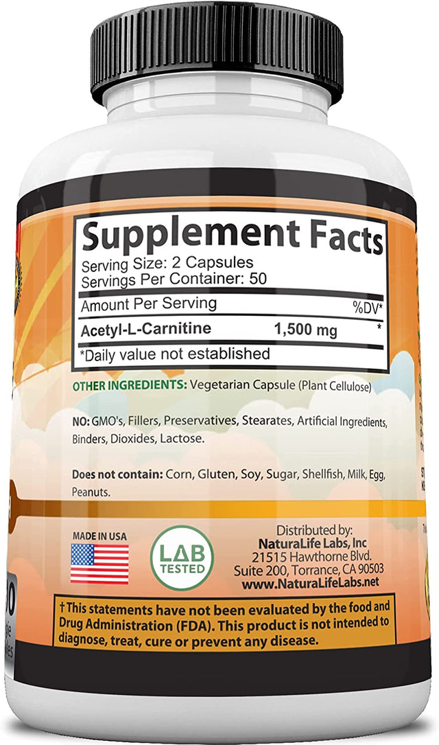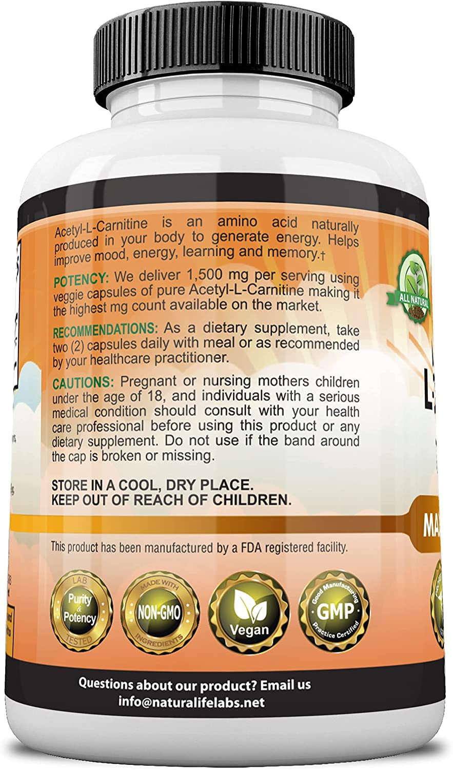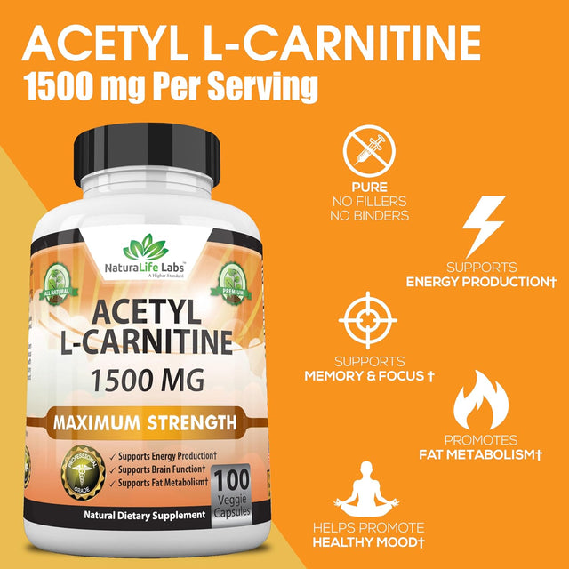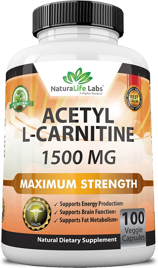 Acetyl L-Carnitine 1,500 Mg High Potency Supports Natural Energy Production, Sports Nutrition, Supports Memory/Focus - 100 Veggie Capsules