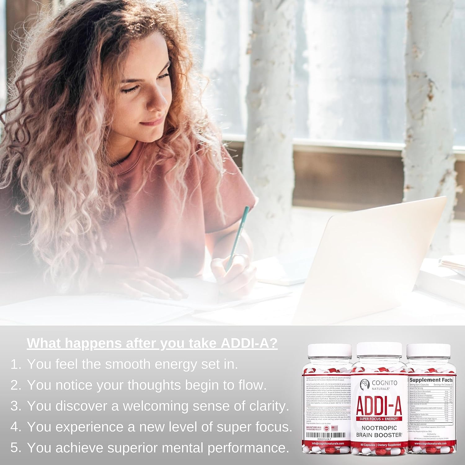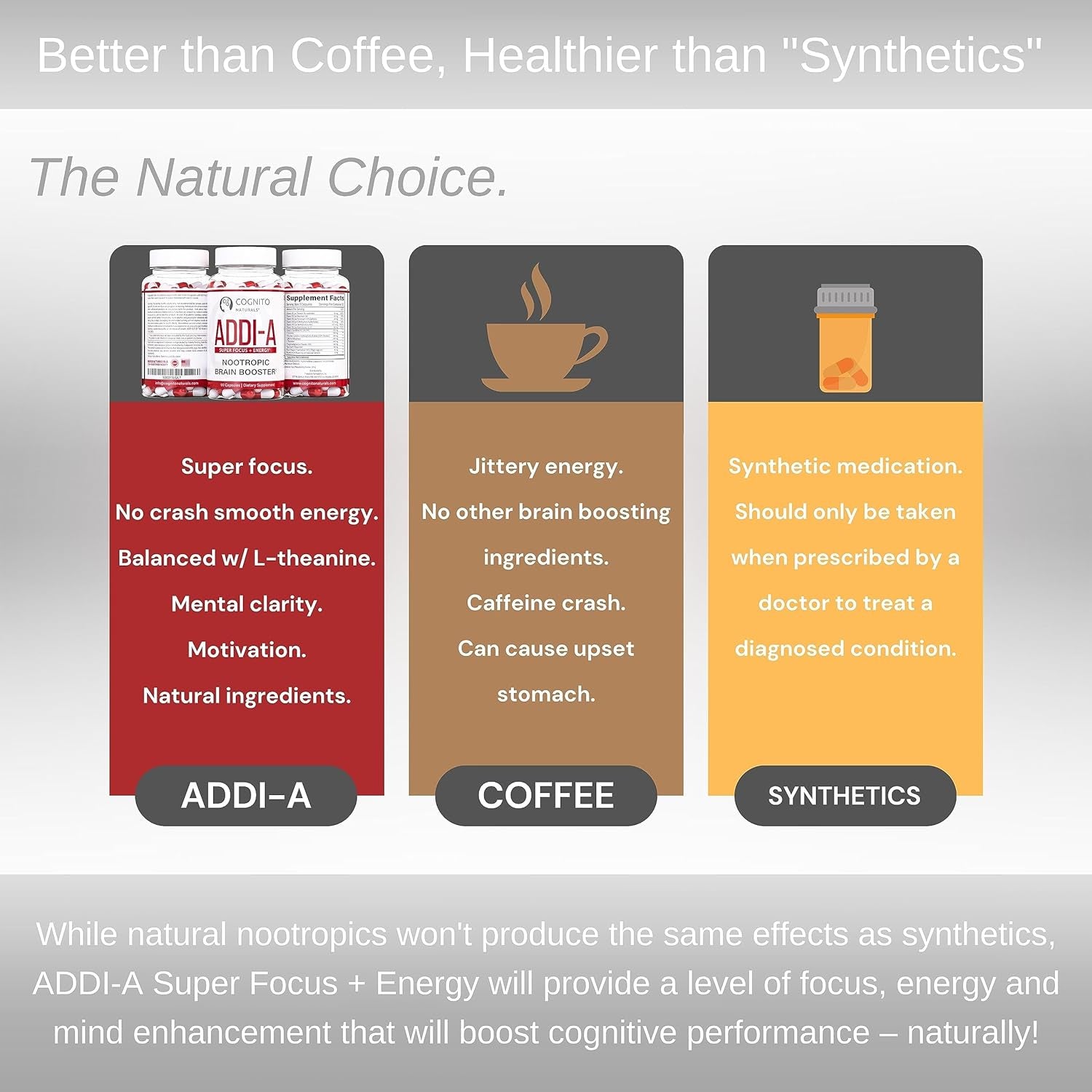 - THE NATURAL CHOICE: While natural nootropics won't produce the same effects as synthetics, ADDI-A will provide a level of focus, energy and mind enhancement that will boost cognitive performance – naturally!