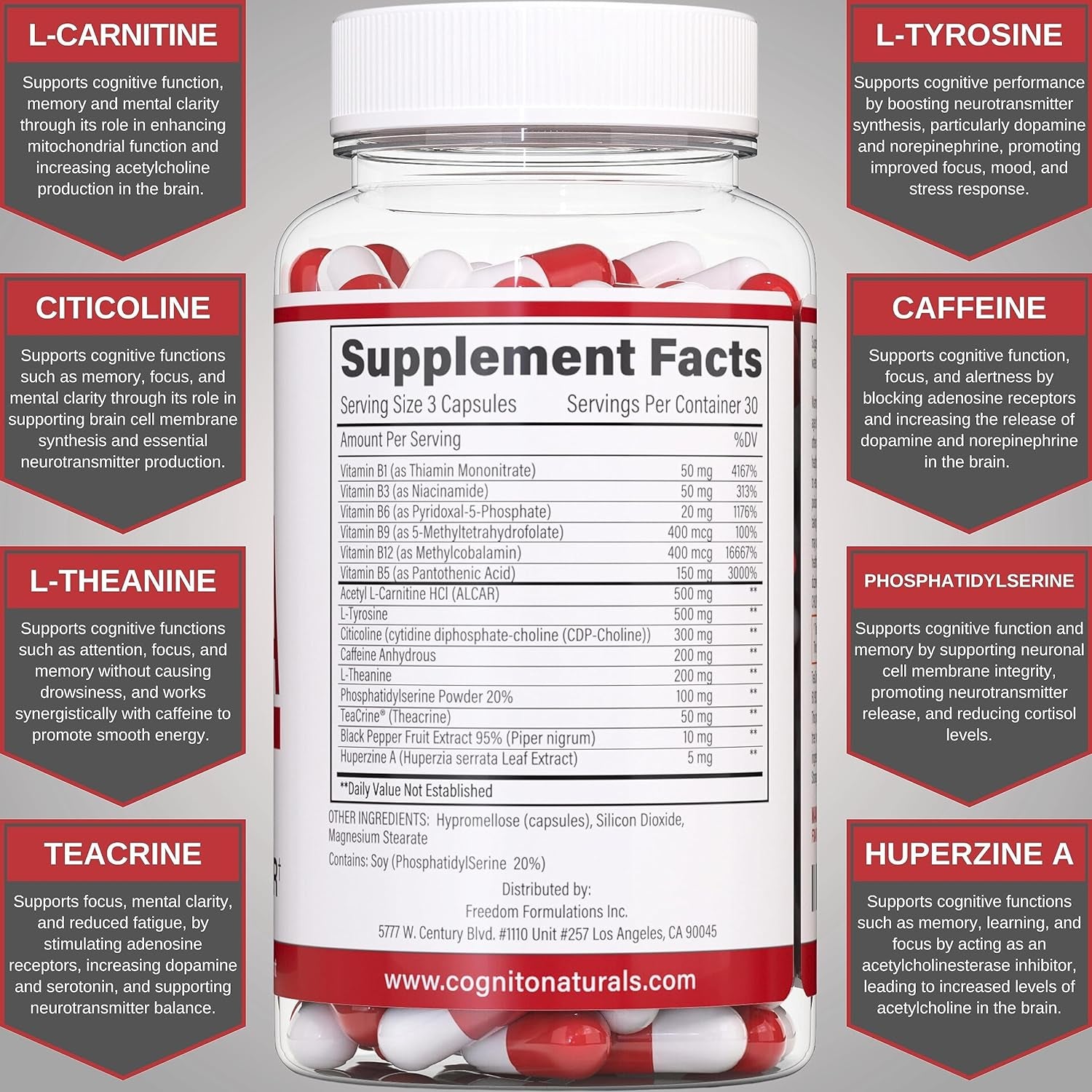 | Ingredients: | 500 mg L-Carnitine, 500 mg L-Tyrosine, 300 mg Citicoline, 200 mg Caffeine, 200 mg L-Theanine, 100 mg Phosphatidylserine, 50 mg TeaCrine, 10 mg Black Pepper Fruit Extract, 5 mg Huperzine A, Vitamin B Complex | 100 mg Caffeine + 200 mg L-Theanine |